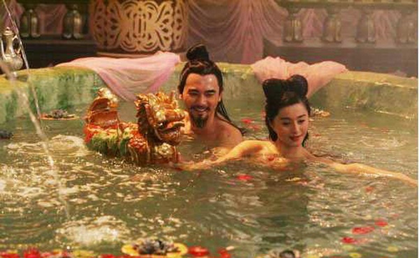 | Phạm Băng Băng vai Dương Quý Phi và Triệu Văn Tuyên vai hoàng đế Lý Long Cơ đã đóng một cảnh tắm "đong đưa tình cảm" khá lãng mạn trong bộ phim truyền hình Đại Đường phù dung viên. |
