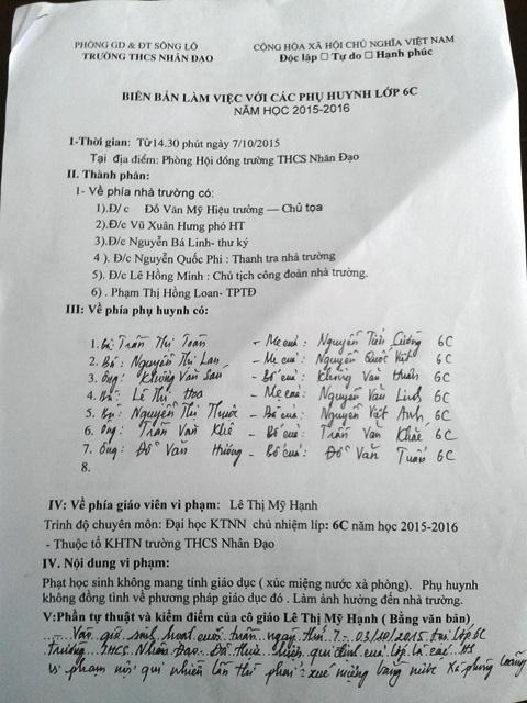 Trước đó, Phòng GD&ĐT huyện Sông Lô nhận được đơn của phụ huynh phản ánh việc học sinh trường THCS Sông Lô bị giáo viên súc miệng bằng nước xà phòng.