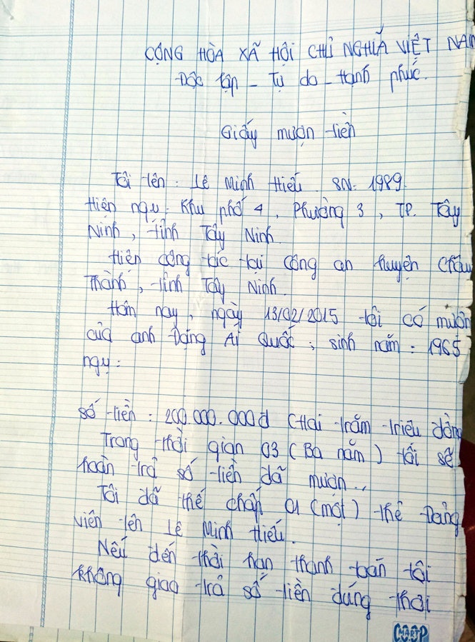 Ông Quốc cho biết từ ngày vay nợ, trung úy Hiếu không đóng lãi nên ông đã tìm và tự ghi vào giấy nợ “lãi suất hàng tháng sẽ thanh toán đúng kỳ hạn là ngày 15 hàng tháng. Nếu trễ, ông Quốc có quyền thu hồi nợ”.