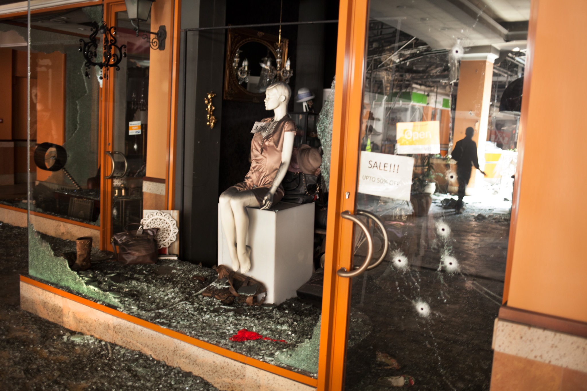 | Cảnh tượng đổ nát ở khu vực đỗ xe. Nhiều nhân chứng kể rằng một số kẻ bắt cóc con tin đã vứt súng, mặc quần, áo của các nạn nhân rồi trà trộn vào dòng người để thoát ra ngoài trước khi lực lượng an ninh đột kích vào bên trong khu mua sắm. |