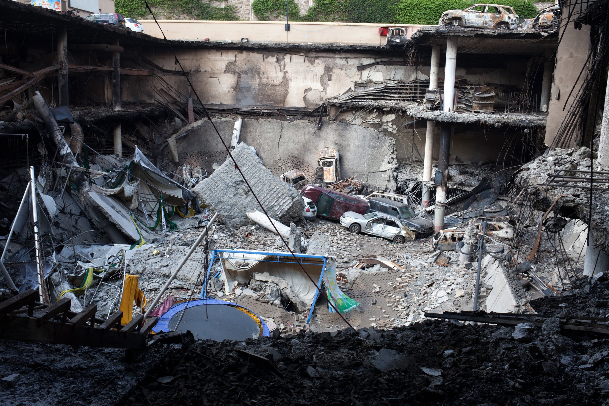 | Gạch, thanh sắt vương vãi xung quanh một cầu thang cuốn. |