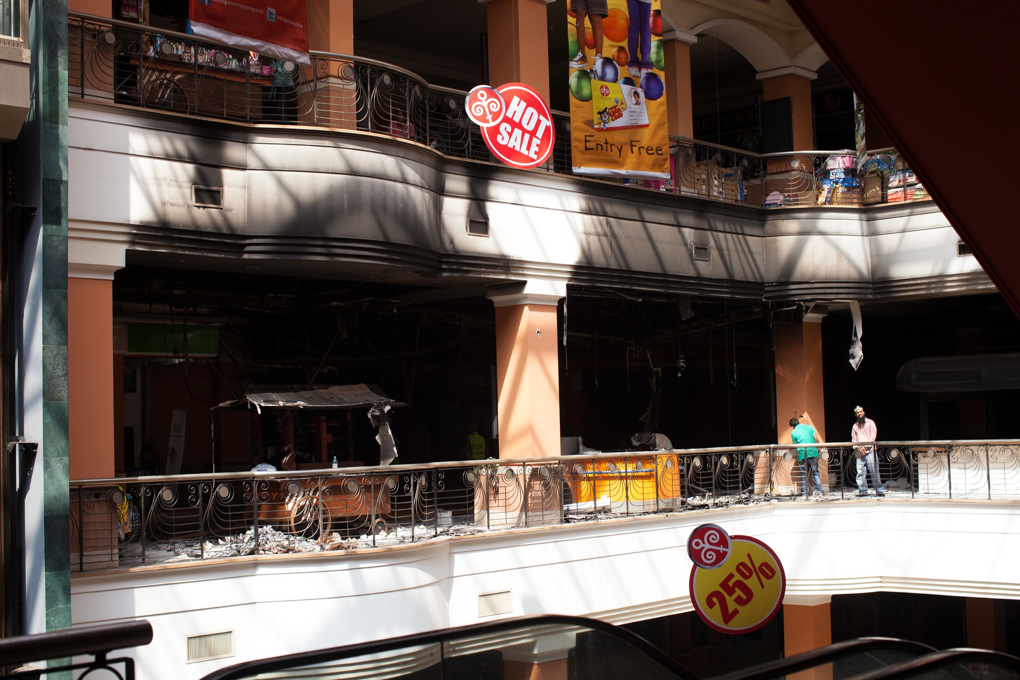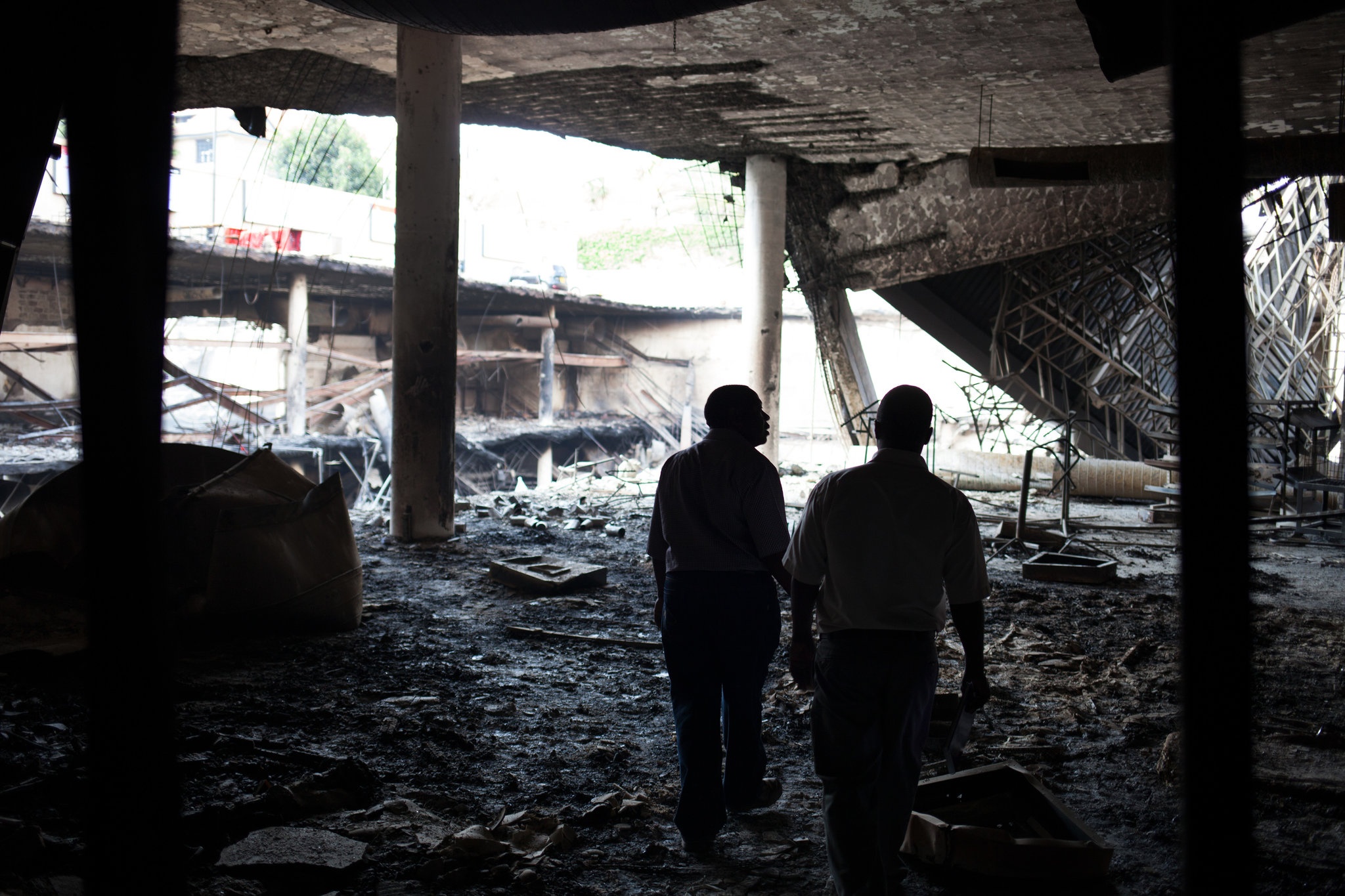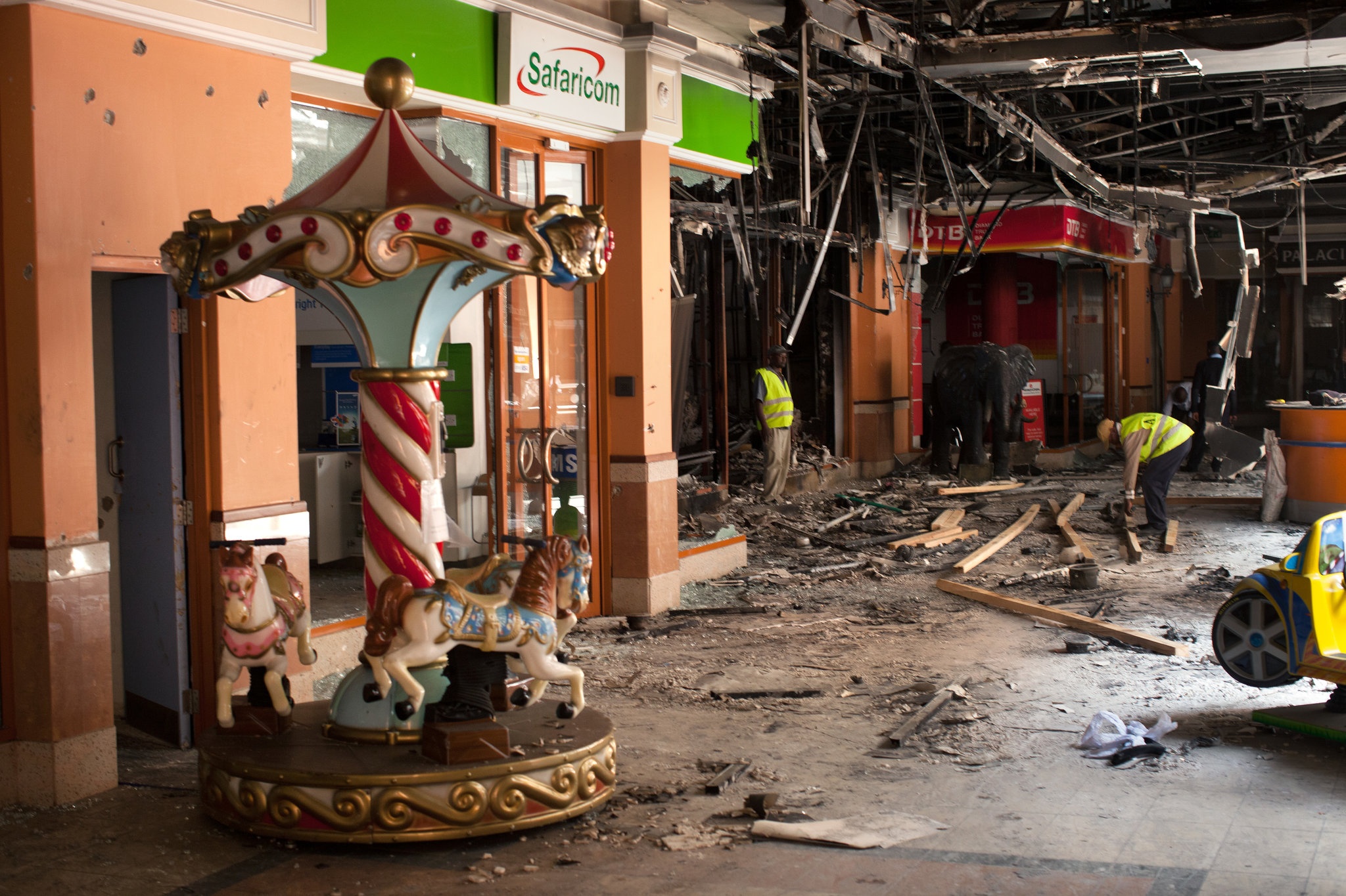 | Một khu vực trong trung tâm mua sắm Westgate sập do binh sĩ Kenya đánh bom để tấn công bọn khủng bố. Người ta thường gọi Kenya là "ốc đảo hòa bình" của châu Phi. Giới chức Kenya chưa thể giải thích tại sao bọn khủng bố có thể thuê một gian hàng bên trong khu mua sắm rồi giấu vũ khí trong suốt gần một năm mà không ai phát hiện hành vi của chúng. |
