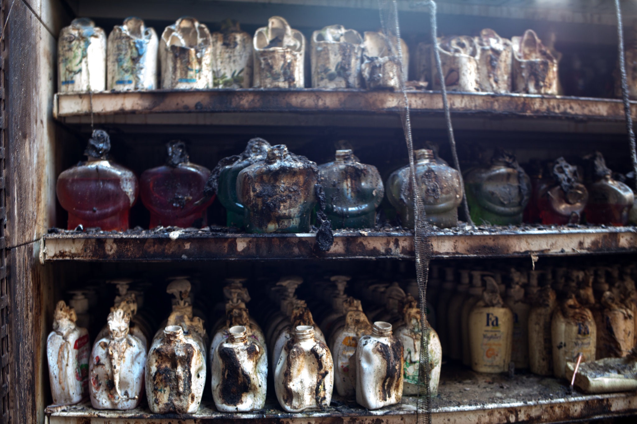 | Các lọ mỹ phẩm cháy nham nhở. |