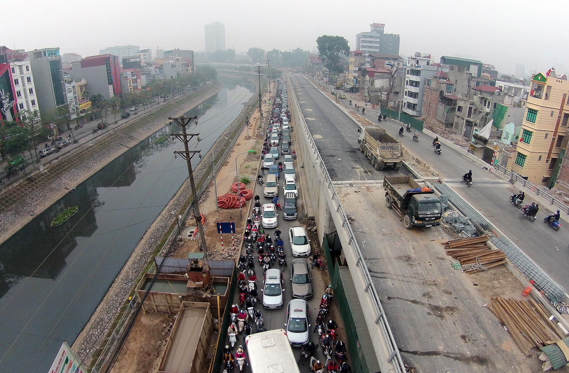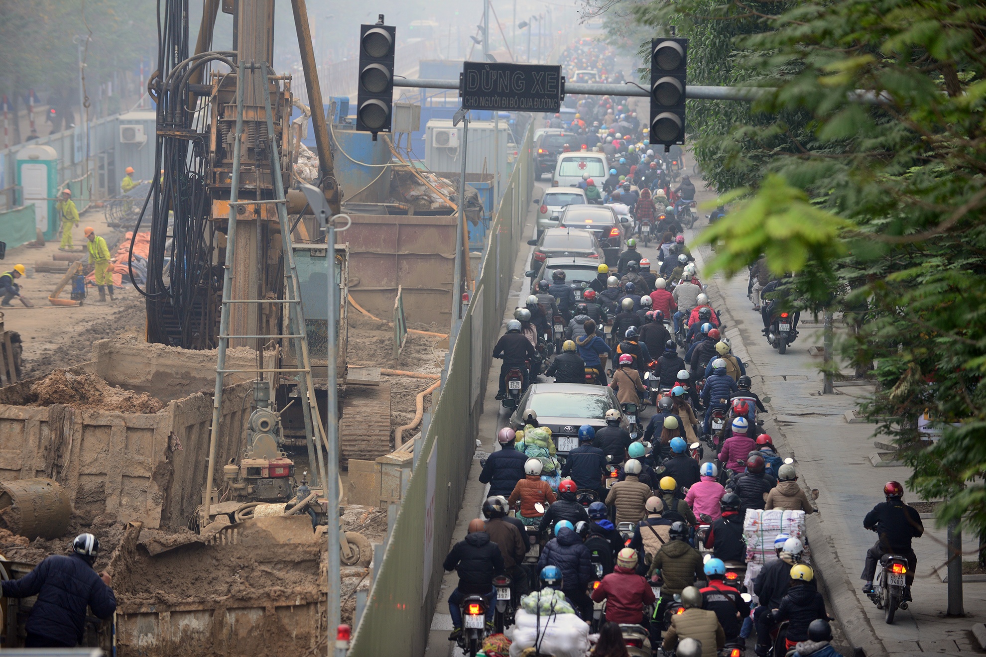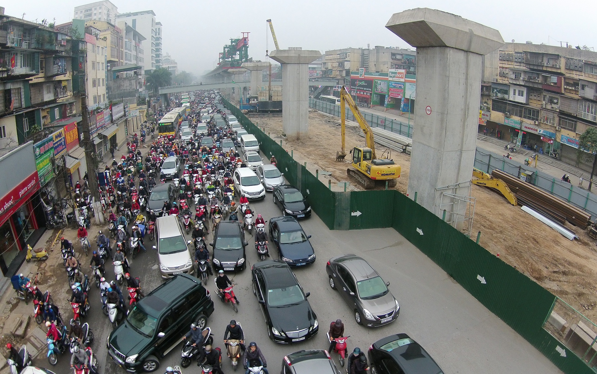 Dịp cuối năm, người Hà Nội đánh vật mỗi giờ cao điểm bởi những con đường dẫn vào trung tâm vốn đông đúc nay lại bị thu hẹp bởi rào chắn, lô cốt công trường. Ngã tư Khuất Duy Tiến - Nguyễn Trãi - Nguyễn Xiển là nốt giao của các tuyến huyết mạch từ Hà Đông, Linh Đàm, Tố Hữu... vào trung tâm thủ đô. Vào giờ cao điểm, số người tham gia giao thông qua đây rất lớn, thường xuyên xảy ra ùn tắc. Tình trạng càng thêm trầm trọng khi rất nhiều lô cốt thuộc công trình đường sắt trên cao được dựng lên vào dịp cuối năm.