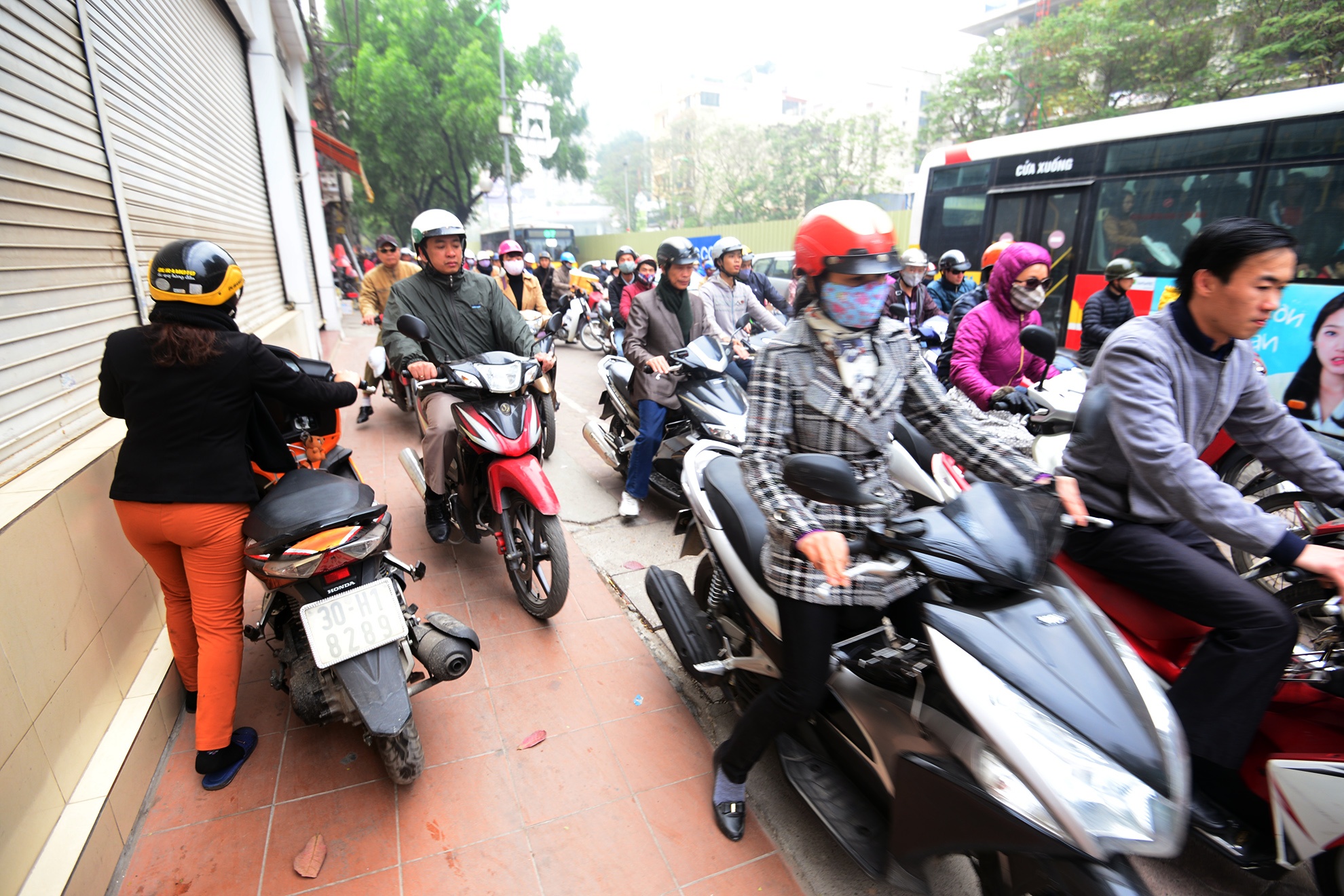 Xe máy tràn lên vỉa hè, chen chân cùng với người đi bộ vào sáng sớm.