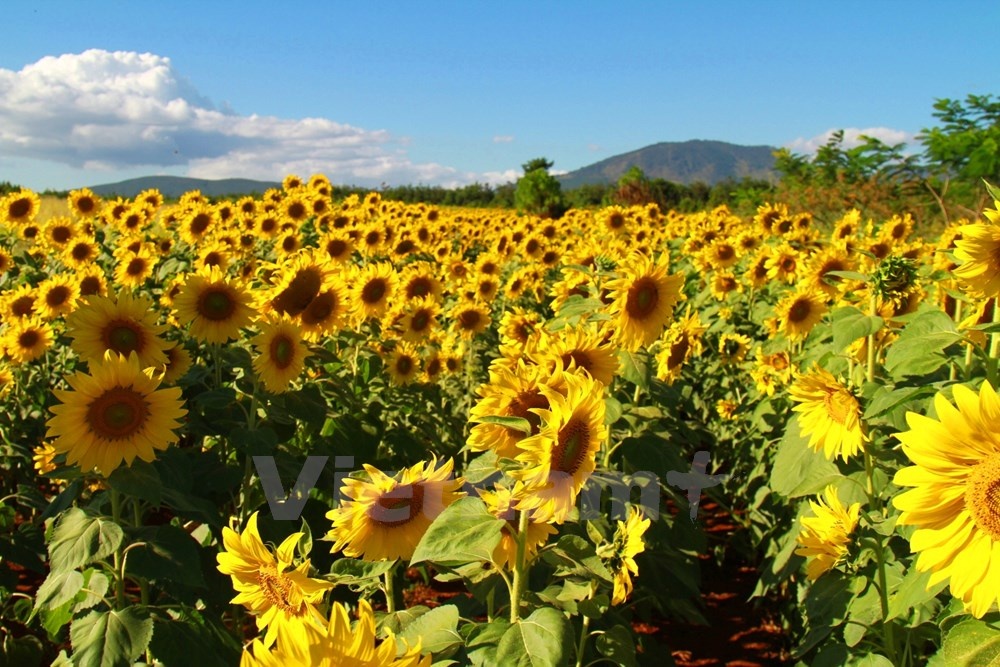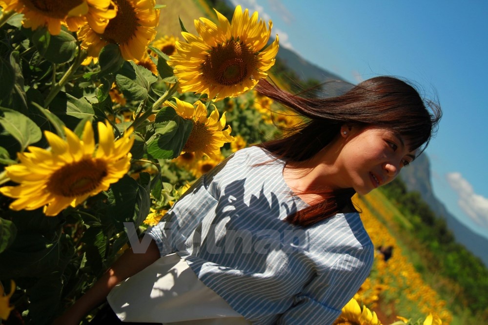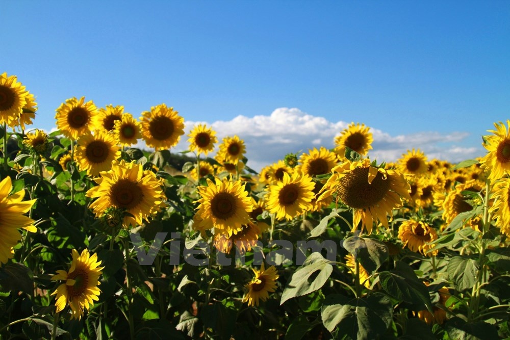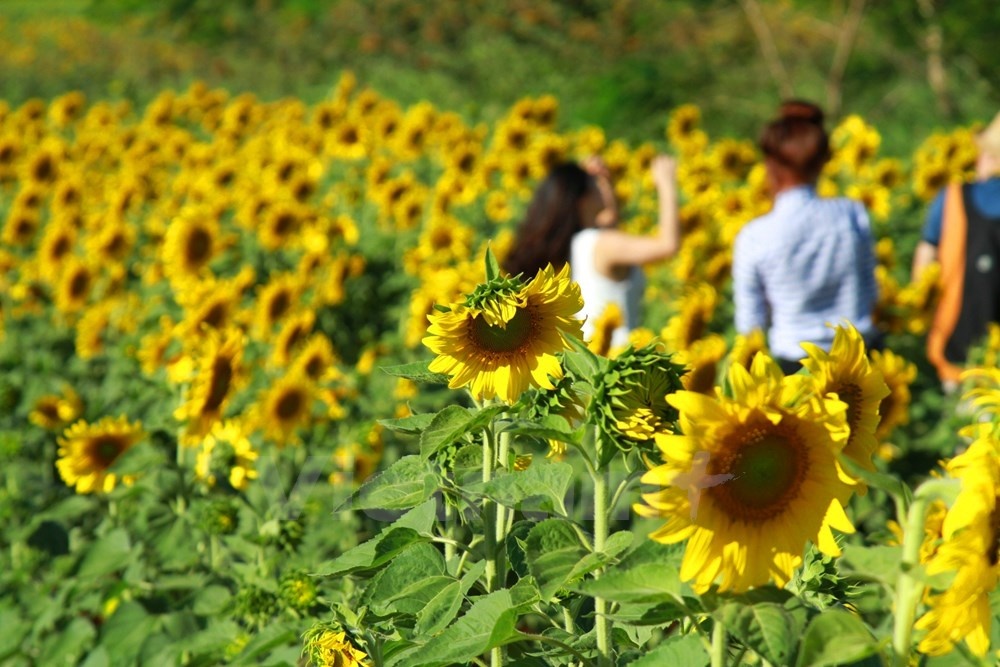| Nếu ở Vinh, cánh đồng hoa hướng dương đang nở lác đác thì tại thời điểm này cánh đồng hoa hướng dương nằm đã nở rộ. |