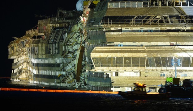 | Sau khi nằm nghiêng suốt hơn 20 tháng, ngày 17/9, siêu tàu du lịch Costa Concordia trị giá 570 triệu USD quay trở lại tư thế bình thường nhờ nỗ lực trục vớt kéo dài gần một ngày. |