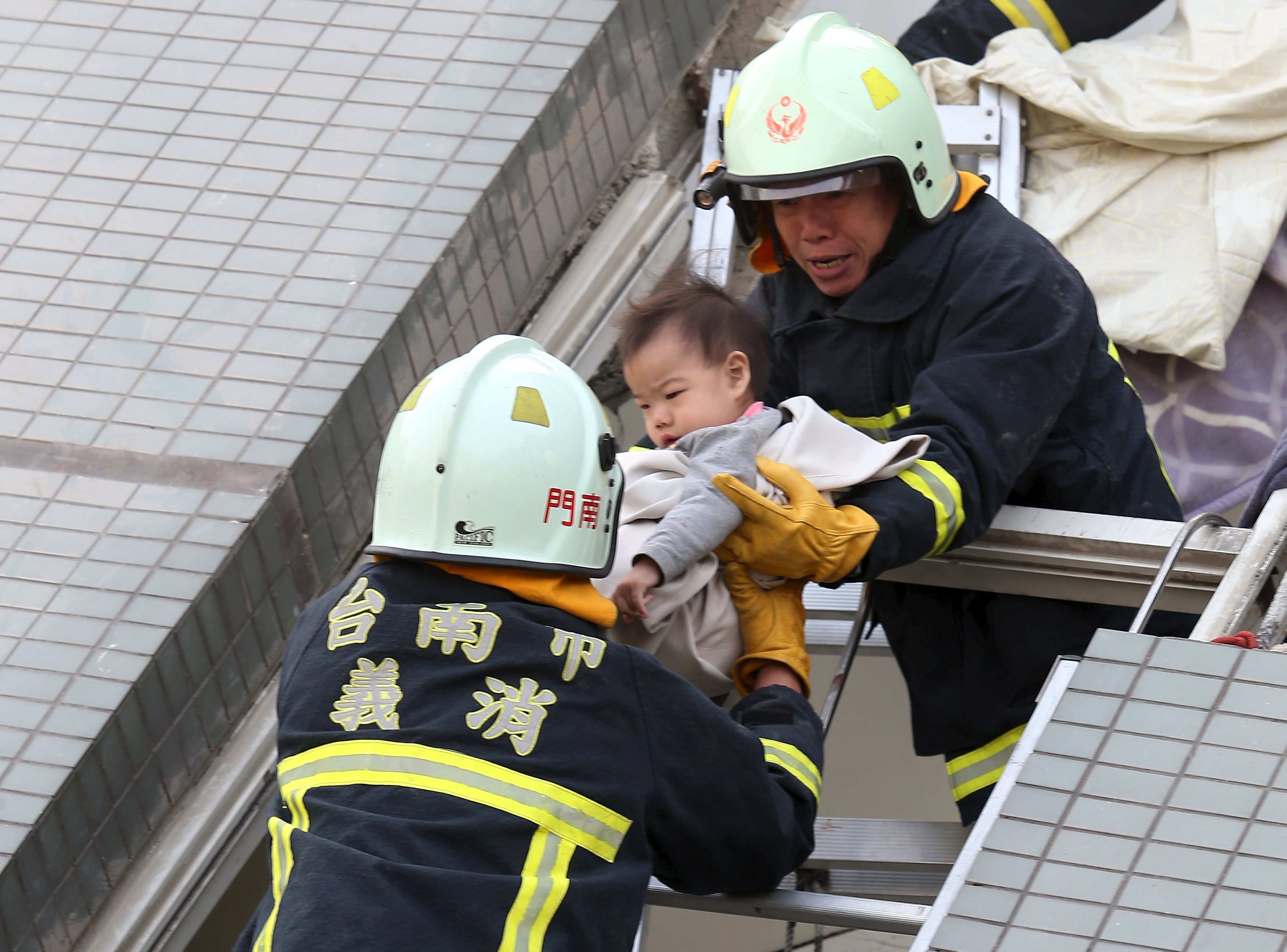 | Đội cứu hộ bế một em bé ra khỏi hiện trường vụ sập chung cư do động đất. Đến 8h30 (giờ Hà Nội), một lính cứu hỏa cho biết anh và các đồng nghiệp đã giúp đưa hơn 100 người ra ngoài an toàn. Sở Cứu hỏa Đài Nam cho biết những người này đã được đưa đến các bệnh viện để điều trị vết thương. Ảnh: Reuters |