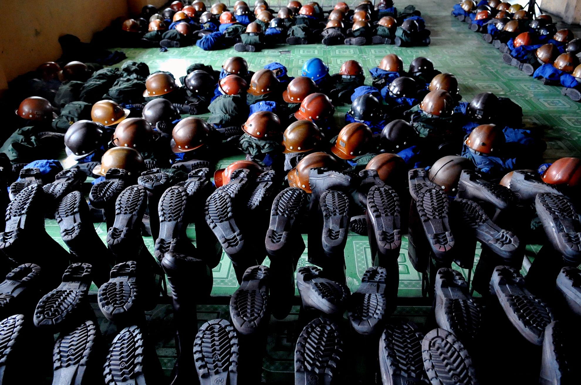 Sau tiếng kẻng, các công nhân bắt đầu vác xẻng rời nhà ở tiến xuống hầm lò.