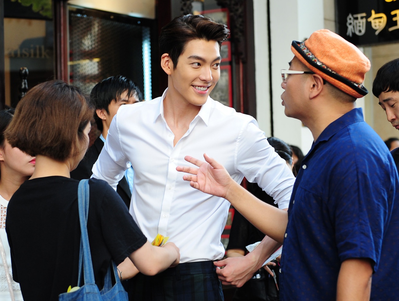 | Kim Woo Bin điển trai trên phim trường. Trước sự cuồng nhiệt của fan Việt, nam diễn viên vừa quay phim, vừa vẫy tay chào các bạn trẻ. |
