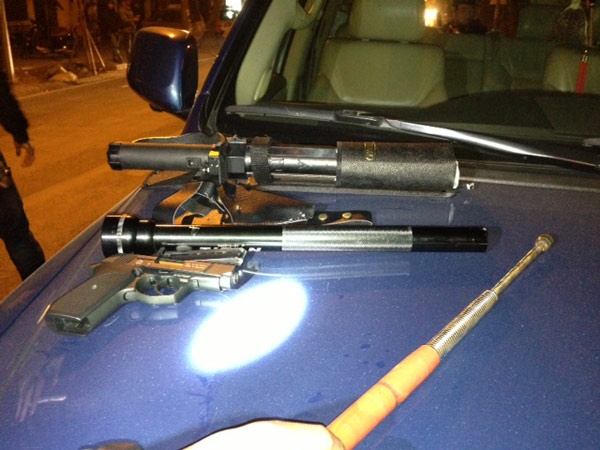 Kiểm tra xe, cảnh sát phát hiện bên trong có khẩu súng ngắn (loại súng bắn đạn hơi cay, bên trong có 7 viên đạn), gậy điện, côn 3 khúc.