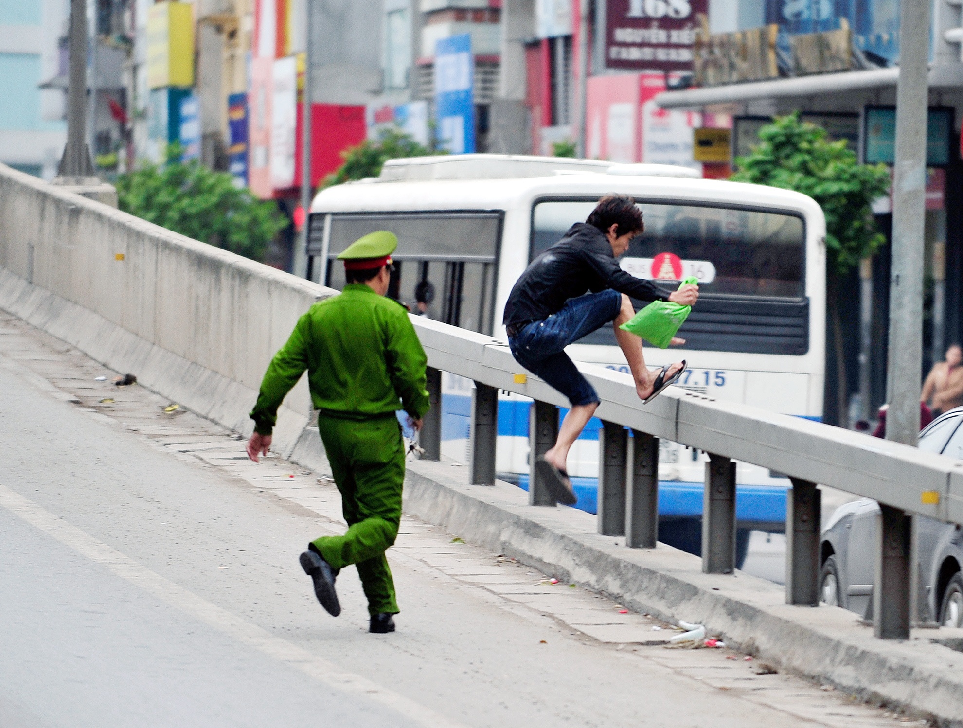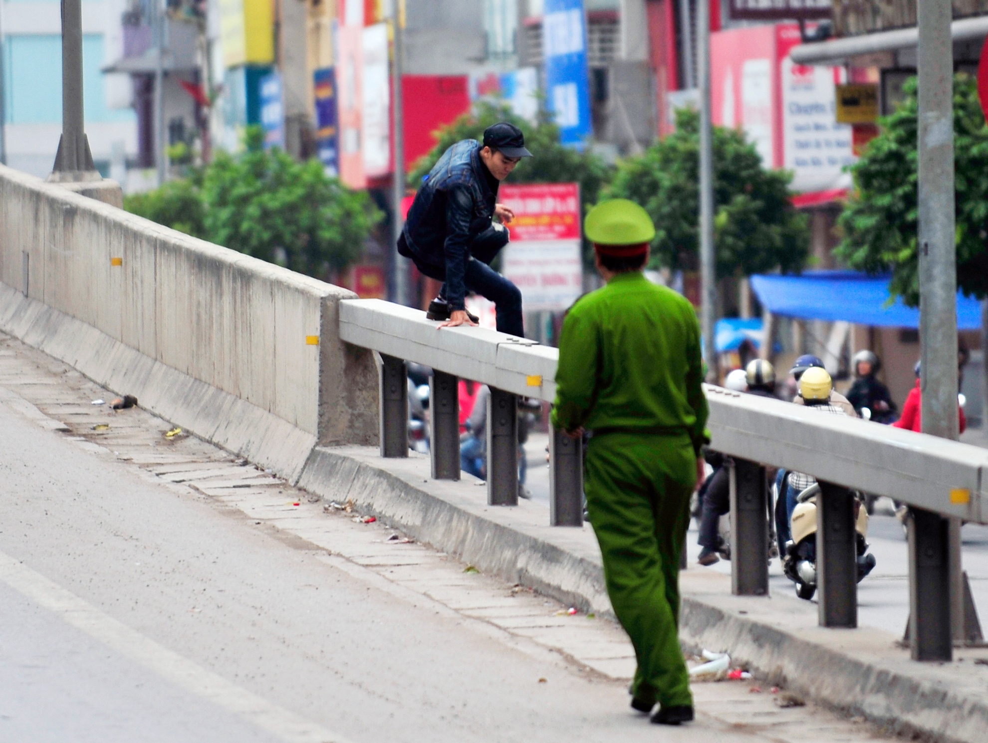 Nhiều thanh niên đi xe máy, đi bộ trên cầu cạn vành đai 3 (Hà Nội) đã bỏ chạy, nhảy rào khi thấy cảnh sát tiến tới. Lần đầu tiên người đi bộ ở Hà Nội bị xử phạt 100.000 đồng.