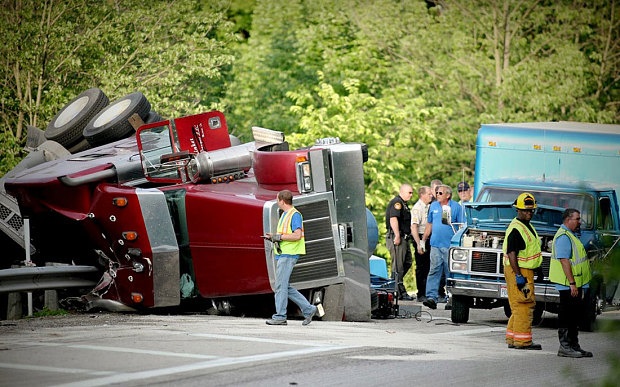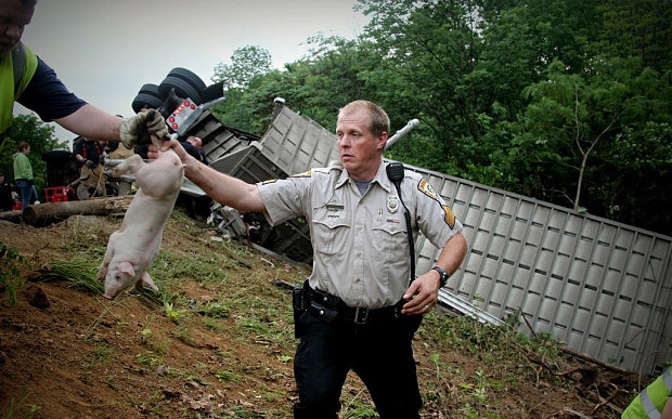 Cảnh sát Mỹ bắt lợn sau khi xe tải lật