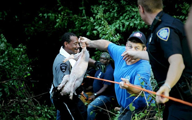 | Theo Telegraph, cảnh sát, các lực lượng cứu hộ và tình nguyện viên tới hiện trường để tìm và bắt những con lợn sống. Ảnh: The Dayton Daily News |