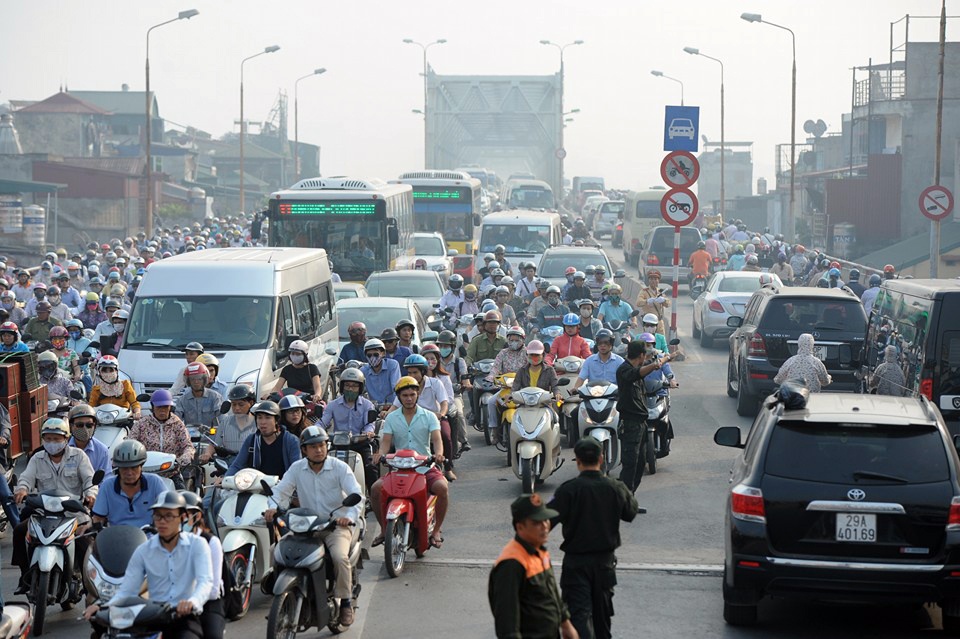 Thiếu úy Phạm Gia Hợp - Đội CSGT số 1 đi bộ ra giữa cầu Chương Dương để phân luồng nhằm ngăn người đi xe máy lấn làn gây ùn ứ.