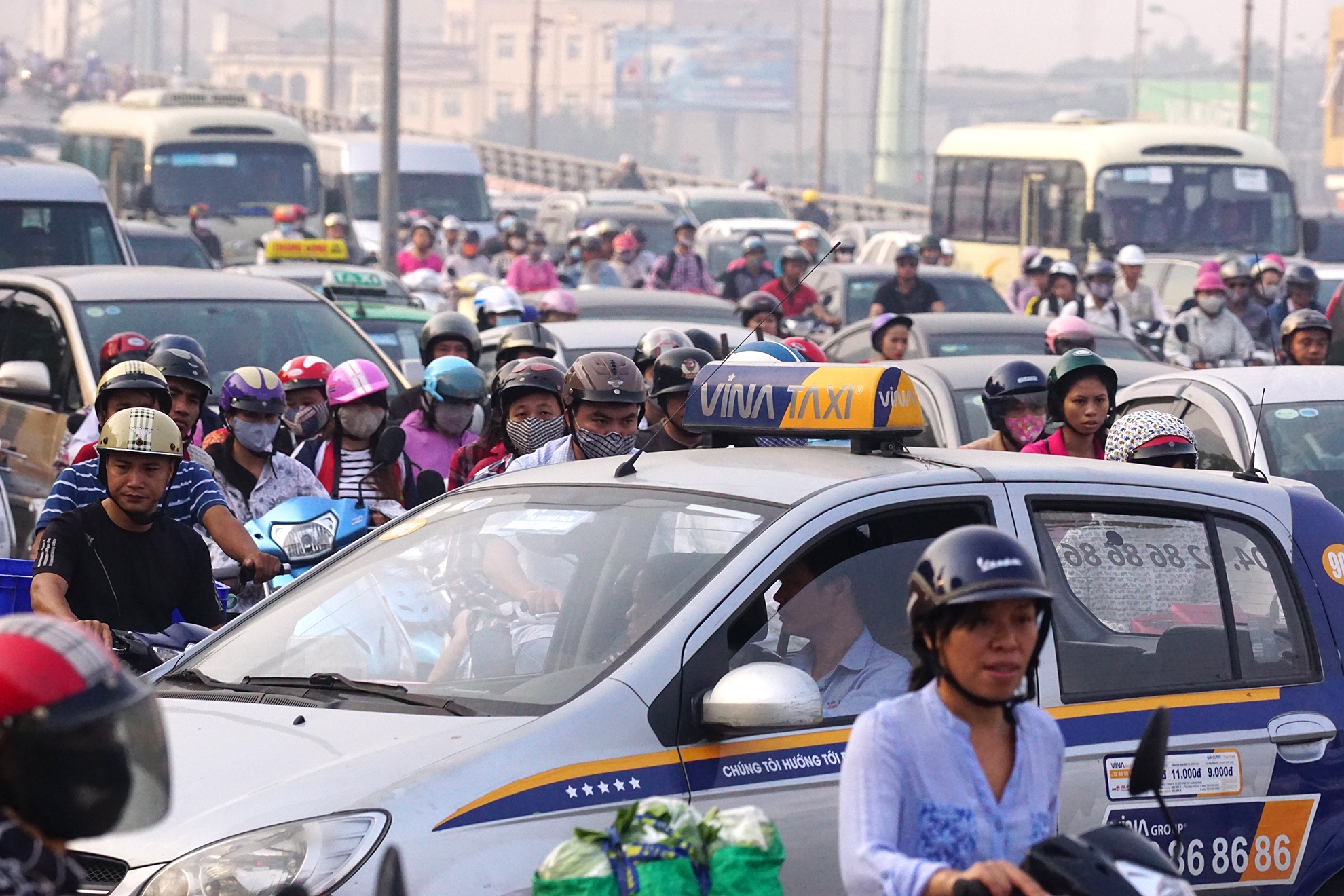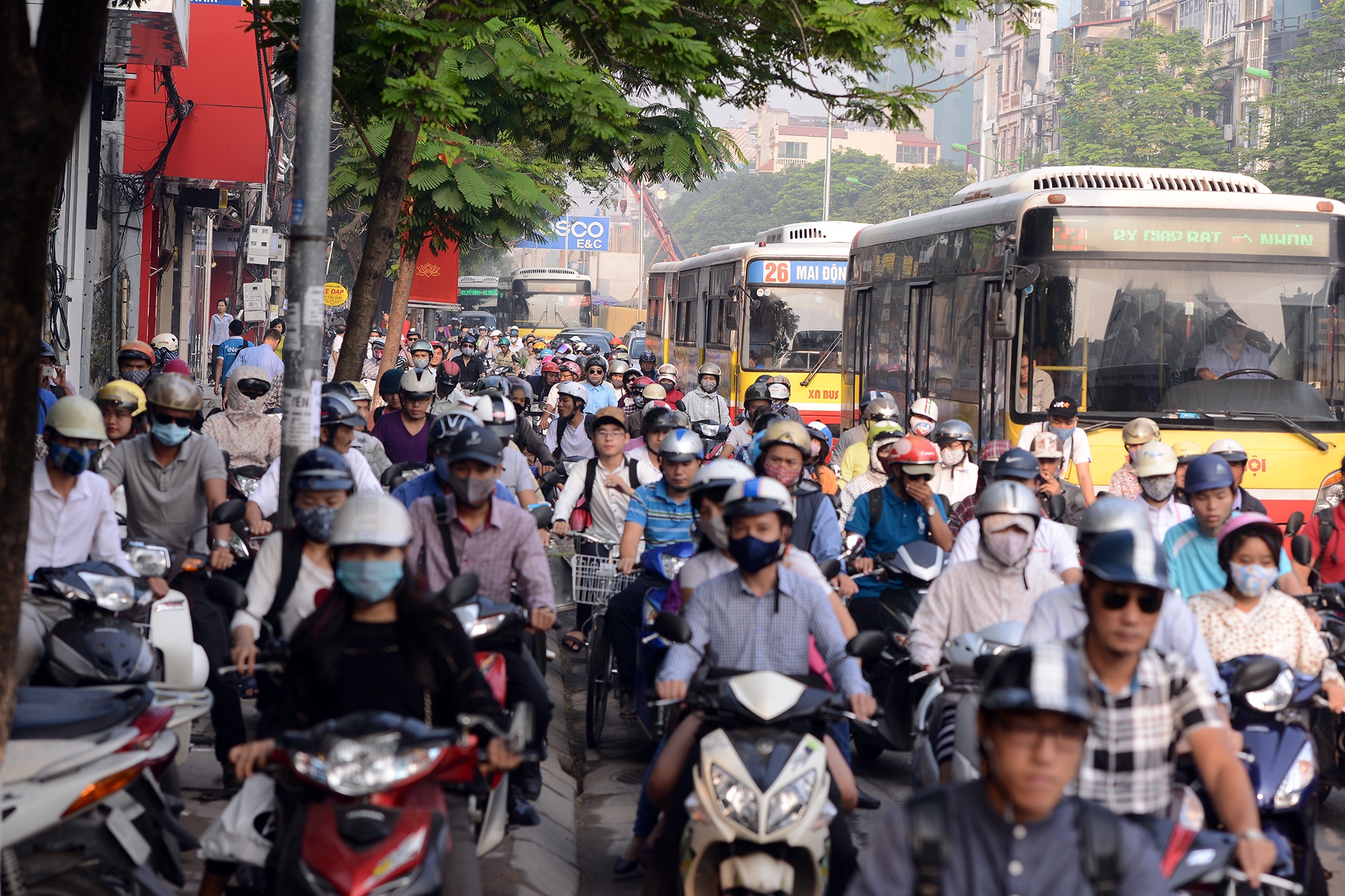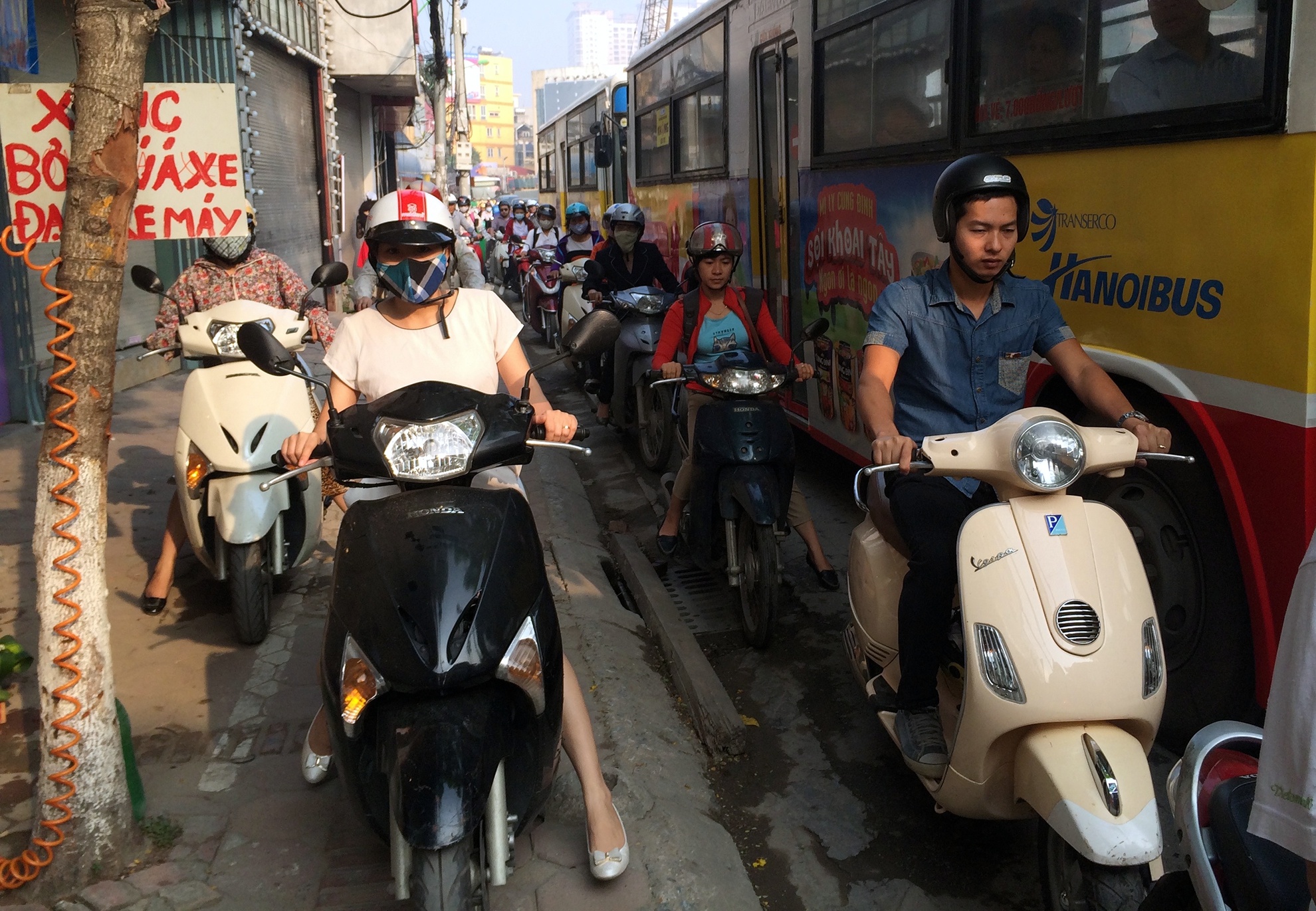 Đoạn từ ngã tư Chùa Hà tới Bưu điện Cầu Giấy dài khoảng 500 m ùn ứ nghiêm trọng. Do công trình đường trên cao dựng rào thi công, lòng đường chỉ còn hơn 3 m, người đi xe máy phải ép sát lề đường thậm chí lao lên cả vỉa hè để đi.