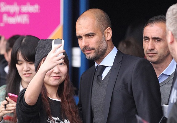 | Fan chụp ảnh "tự sướng" cùng HLV Pep Guardiola. |