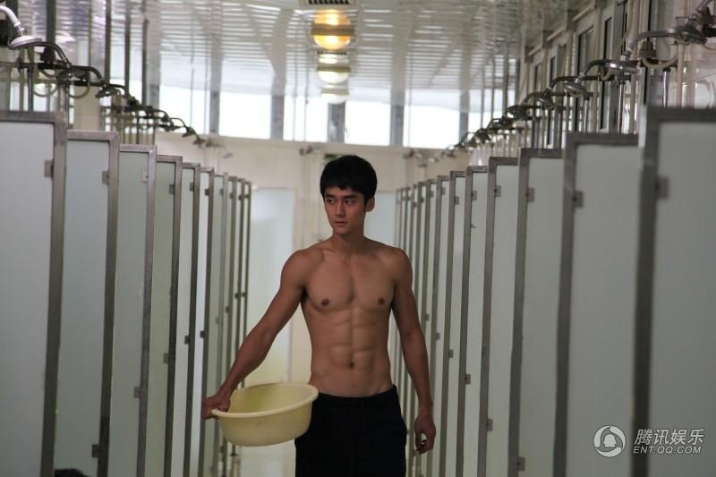 | Tưởng Kình Phu khoe thân hình lực lưỡng và cơ bụng 6 múi. |
