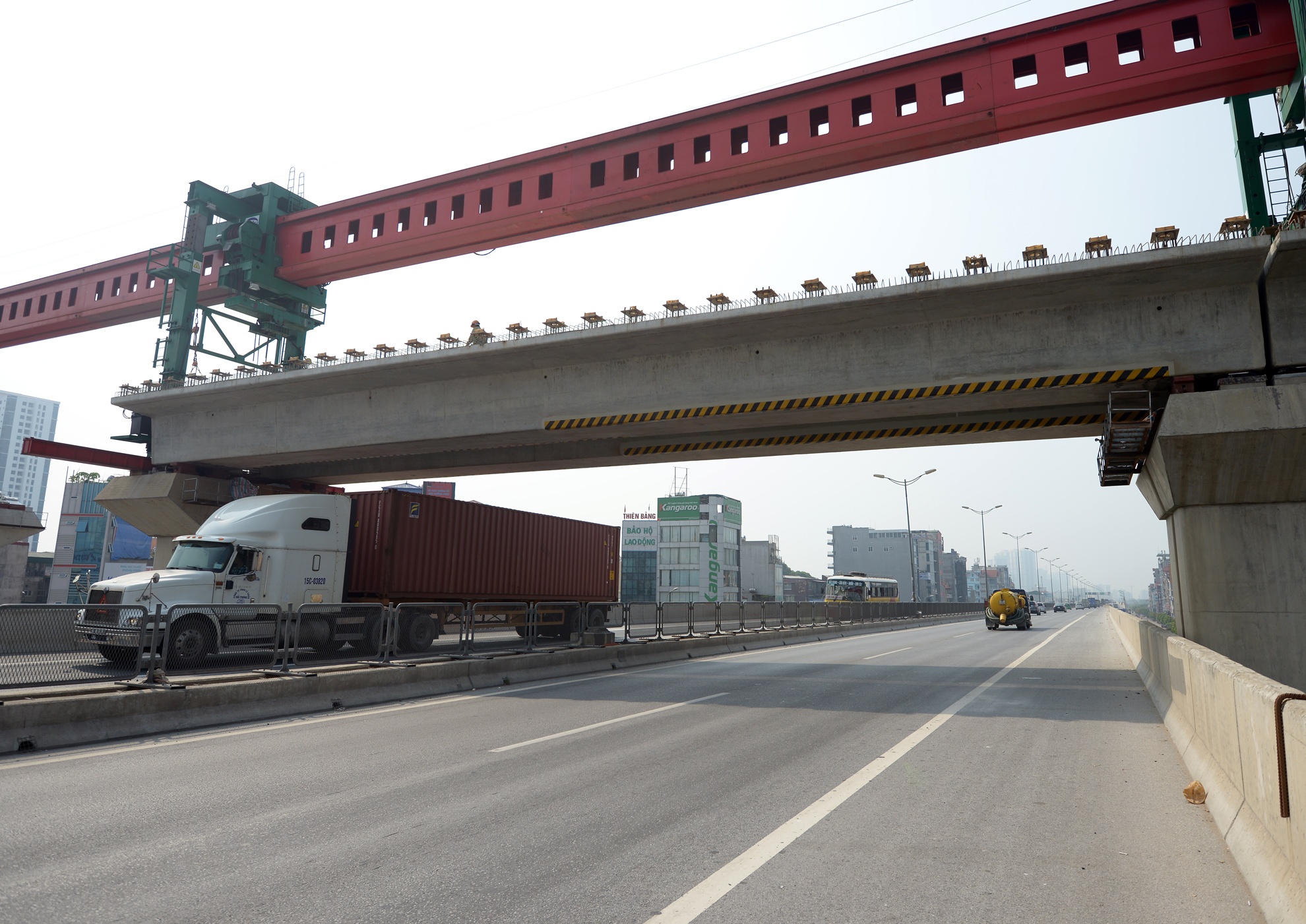 Hình ảnh tại nút giao đường sắt đô thị Cát Linh - Hà Đông và đường trên cao vành đai 3 lúc 9h sáng 14/7. Với khoảng cách chiều cao 5,01 m tính từ mặt đường vành đai 3, các loại xe như container, siêu trường, siêu trọng lưu thông bình thường. Việc lắp đặt thành công hai phiến dầm đặt dấu mốc quan trọng cho việc hình thành nút giao thông 4 tầng đầu tiên tại Việt Nam.