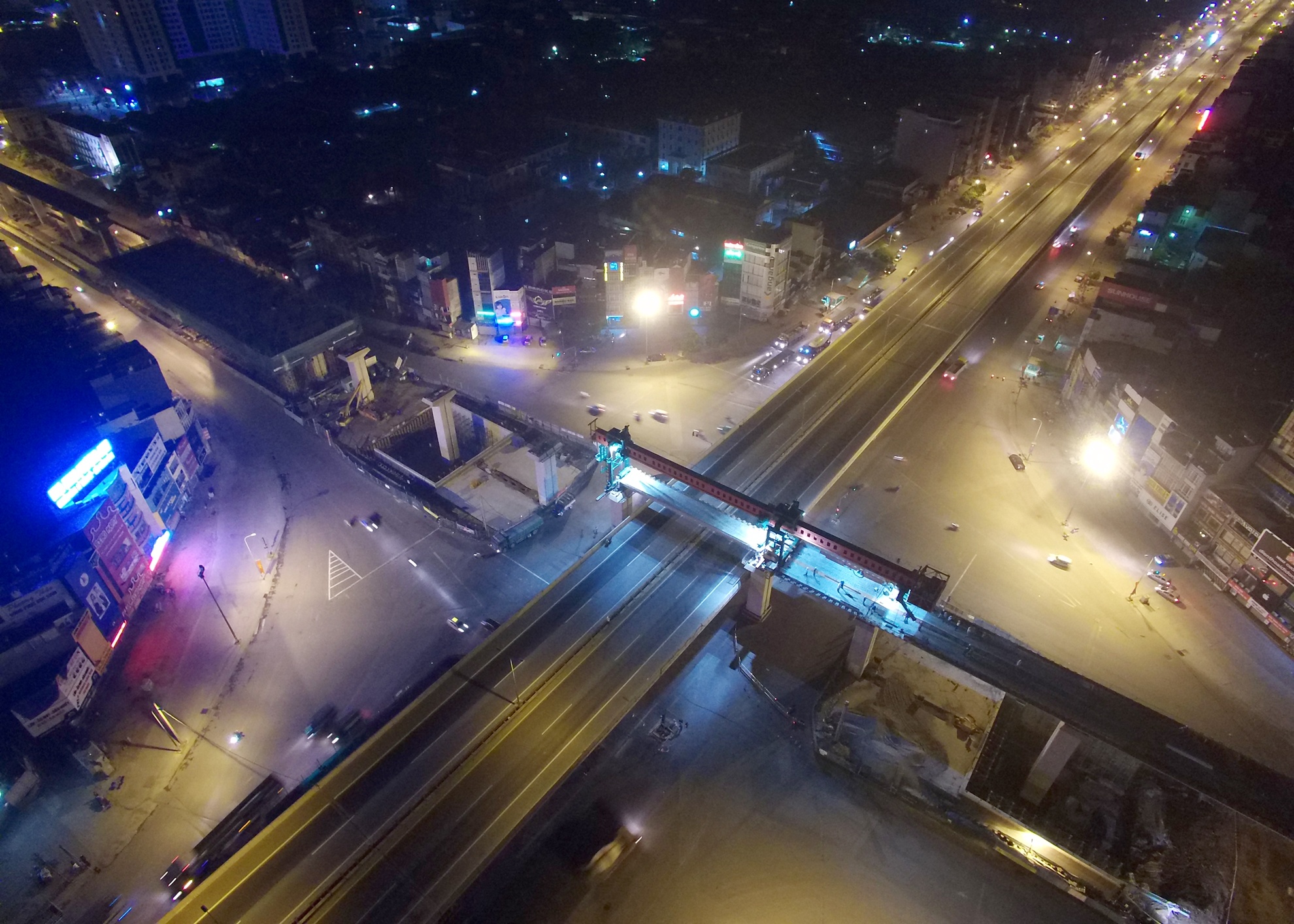 Đêm 13, rạng sáng 14/7, công trình đường sắt đô thị Cát Linh - Hà Đông đánh dấu mốc mới khi bắt đầu lao dầm vượt qua đường trên cao vành đai 3 tại nút giao Khuất Duy Tiến - Nguyễn Trãi - Nguyễn Xiển.