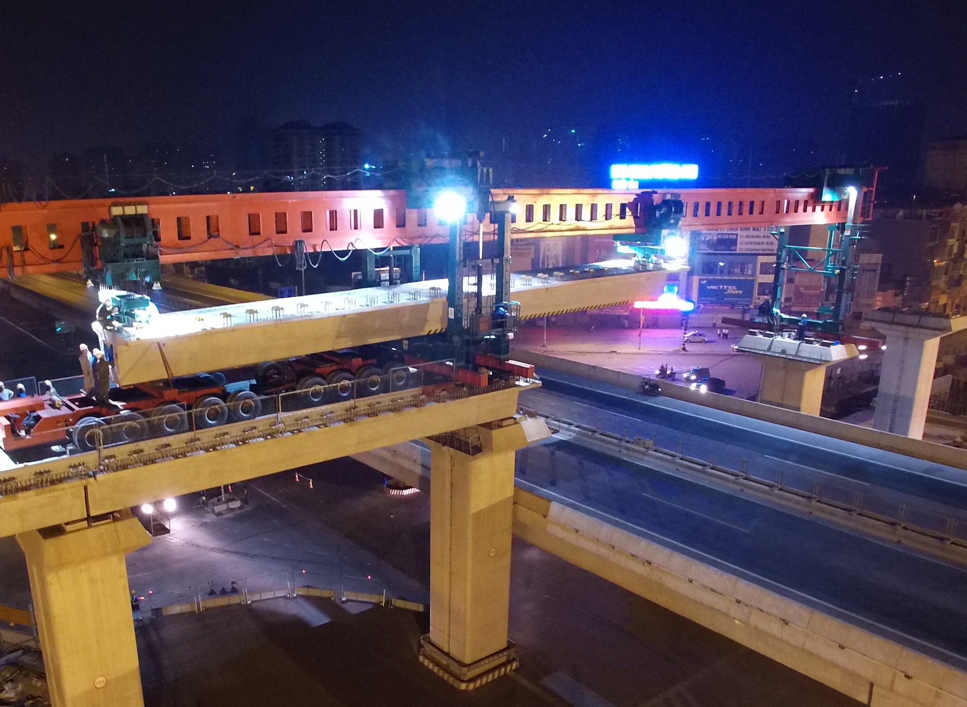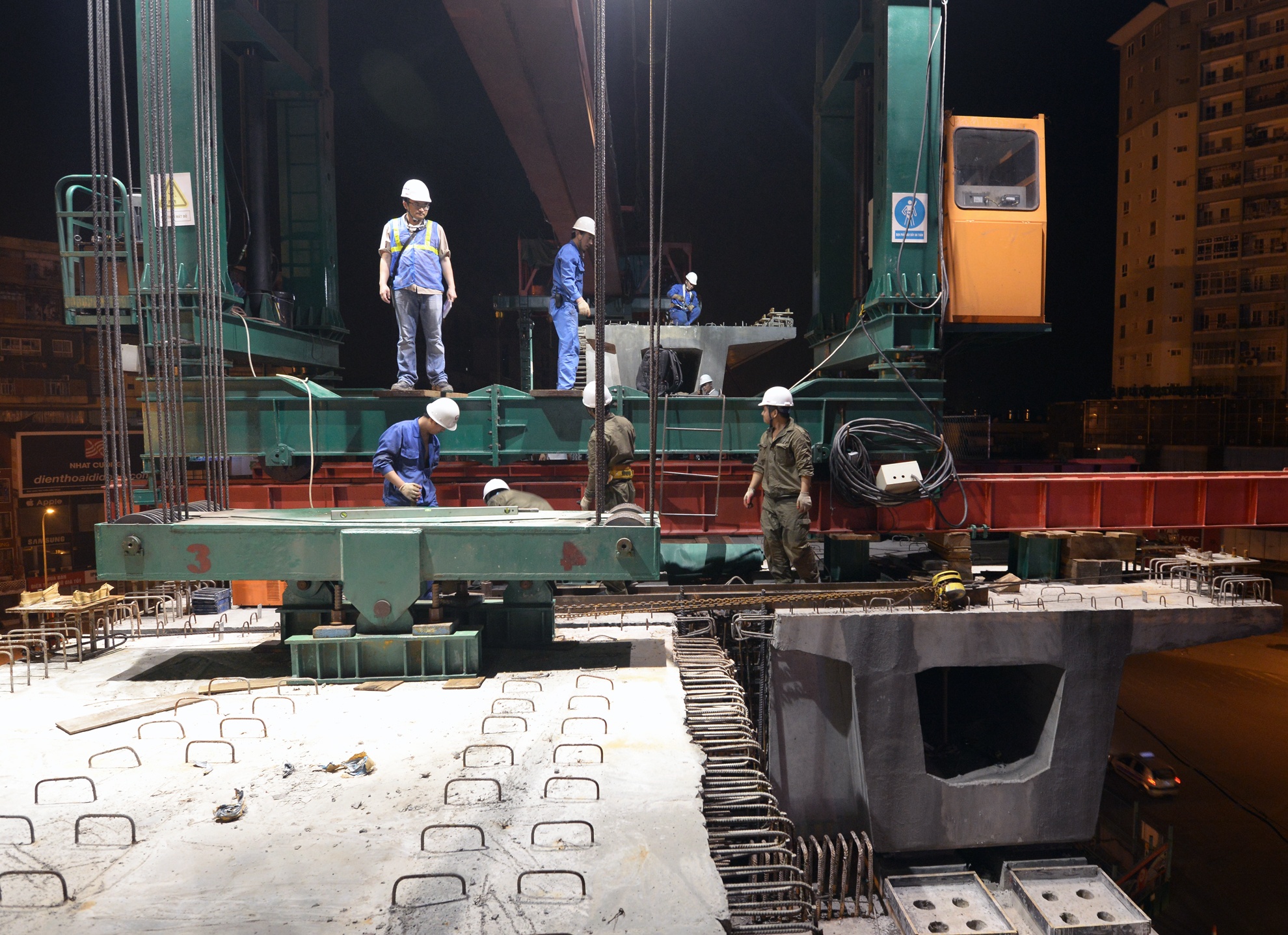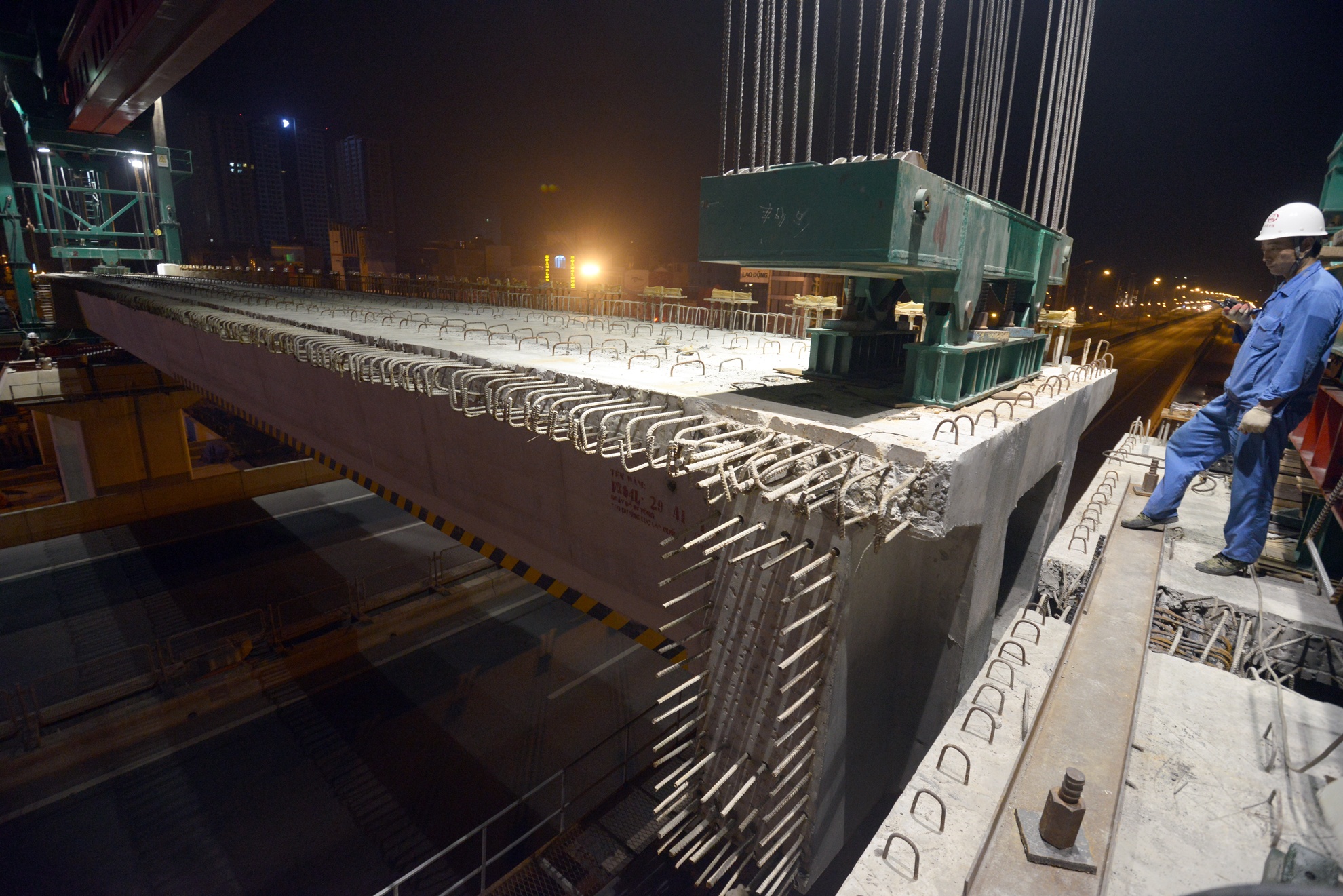 | 3h30 sáng khi phiến dầm thứ nhất vào vị trí chuẩn xác cũng là lúc việc lao tiếp phiến dầm thứ 2. |