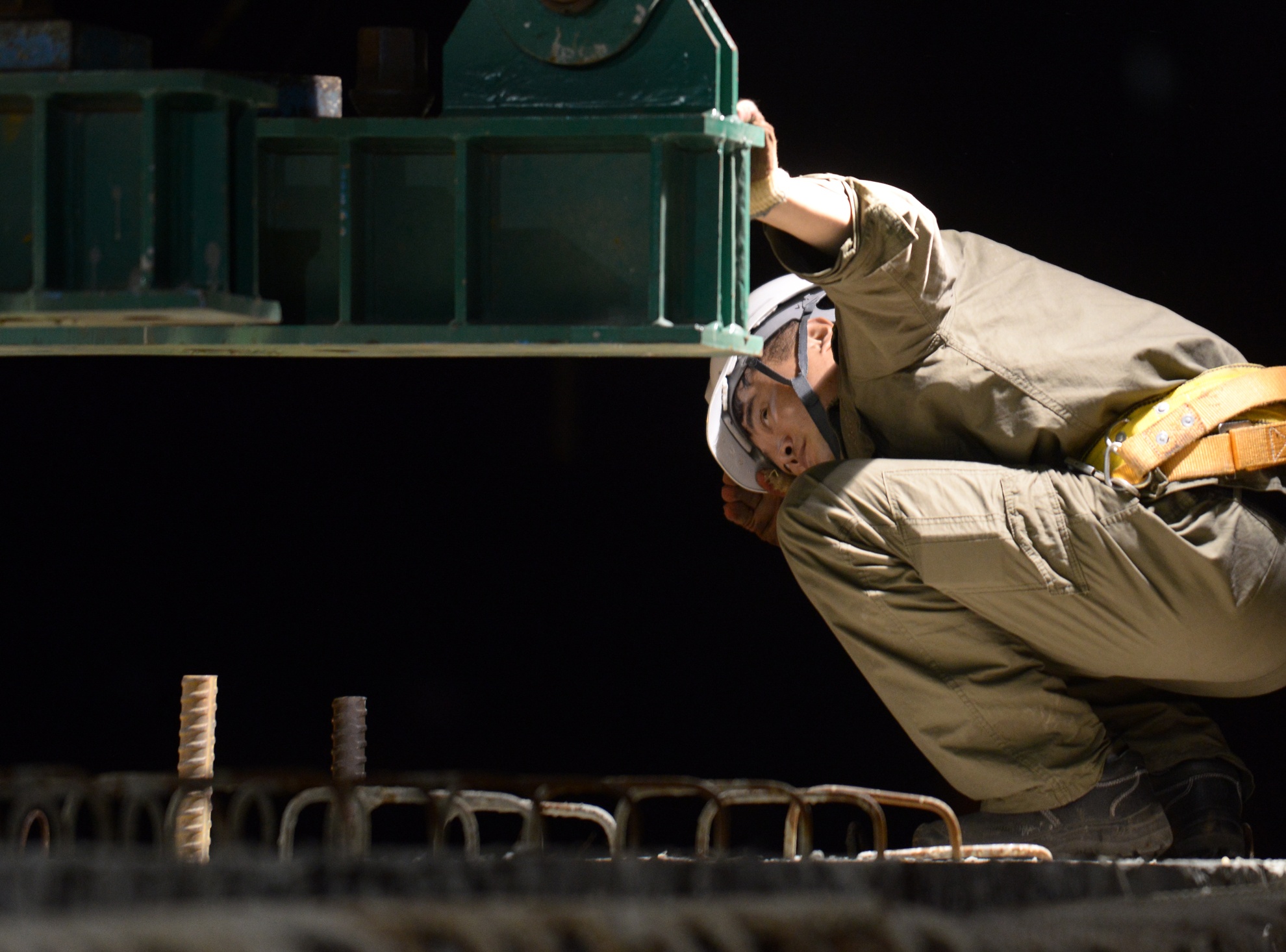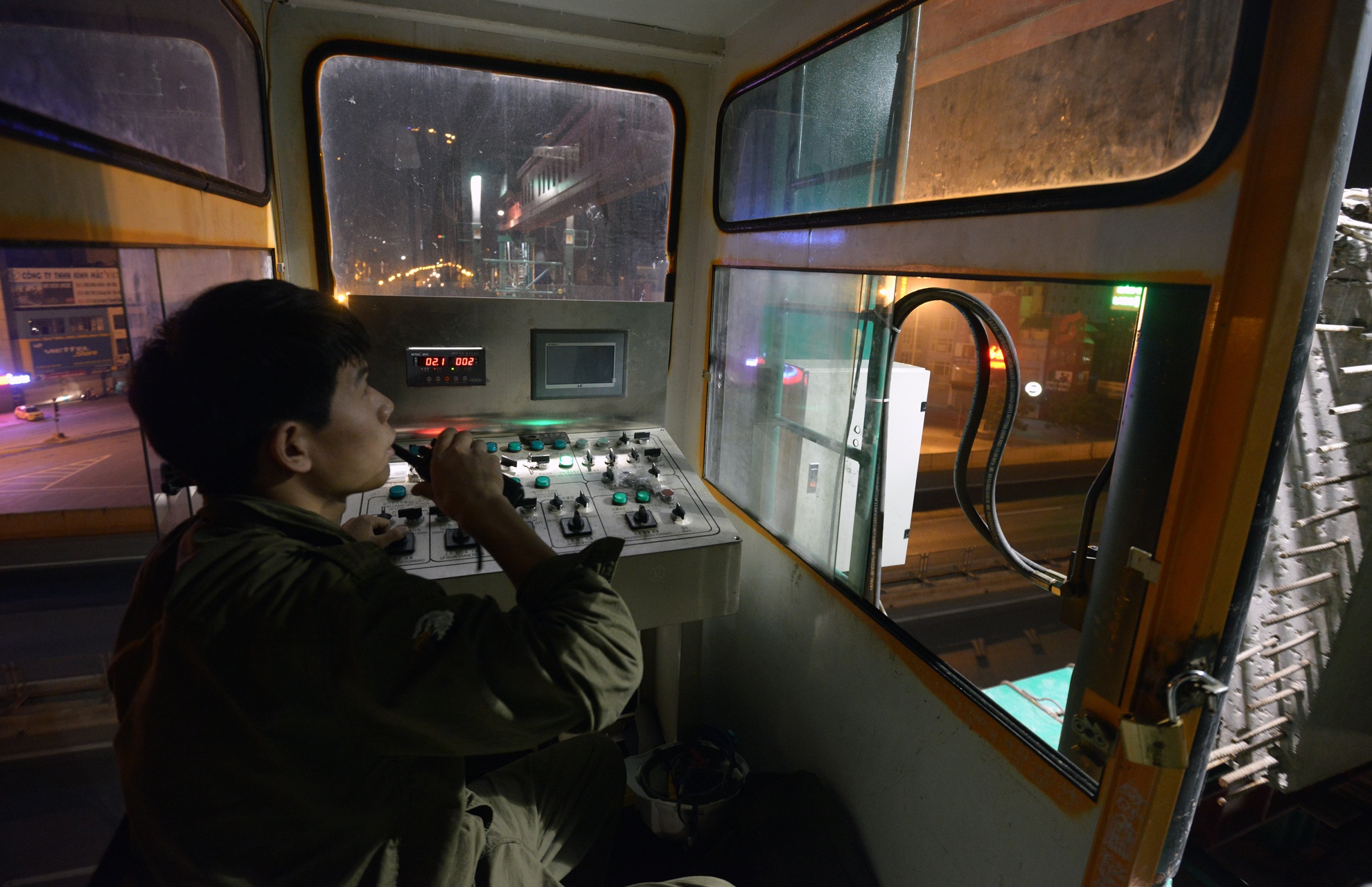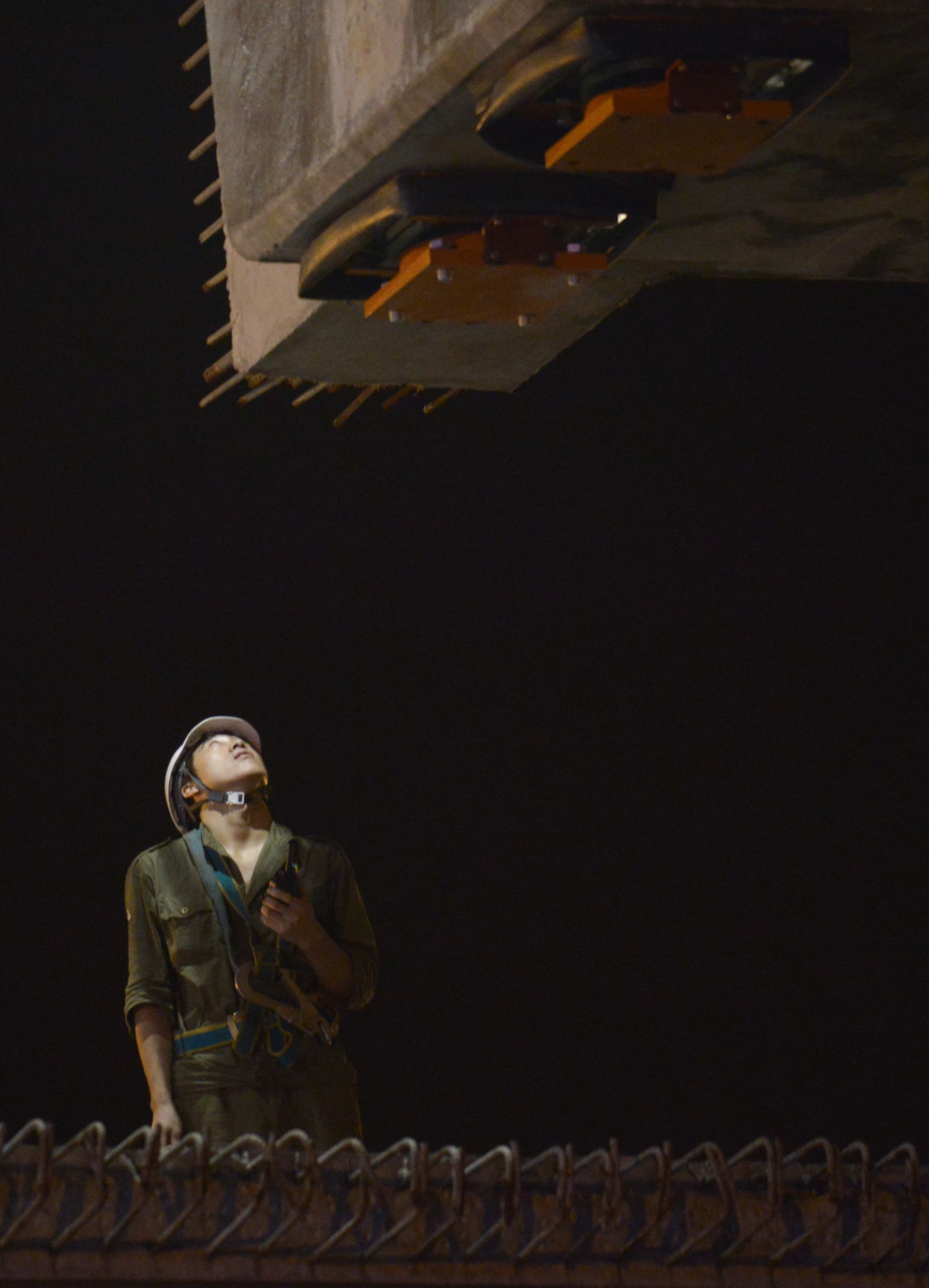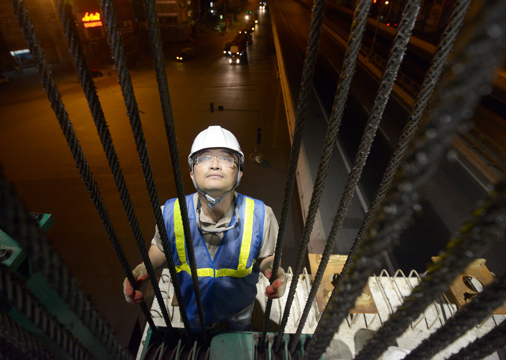 Các công nhân căng mắt theo dõi đề phòng trường hợp có sự va chạm giữa hai phiến dầm khi di chuyển gần nhau. Chỉ cần cơn gió mạnh, độ rung của các phương tiện phía dưới cũng gây nguy hiểm khi di chuyển dầm cồng kềnh và trọng lượng lớn. "Do vậy chúng tôi phải vận hành mọi công đoạn rất từ từ và chính xác đến từng cm để đảm bảo an toàn, chính xác", một kỹ sư cho hay.