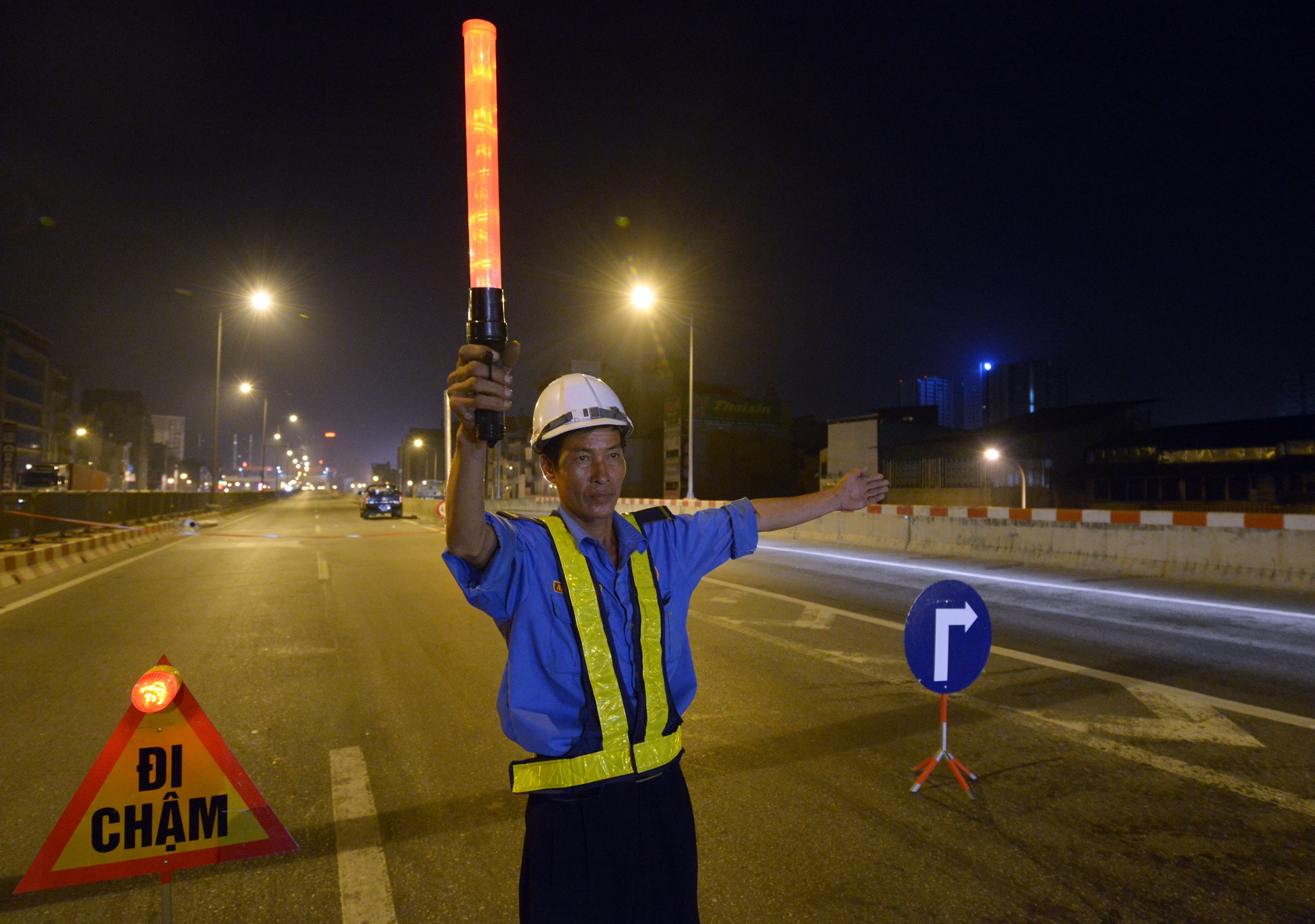 0h sáng 14/7, việc lao dầm bắt đầu triển khai. Hai lối thoát xuống cao tốc gần ngã 4 Nguyễn Trãi - Khuất Duy Tiến được công nhân hướng dẫn đổi hướng di chuyển để phương tiện không đi vào khu vực nguy hiểm.