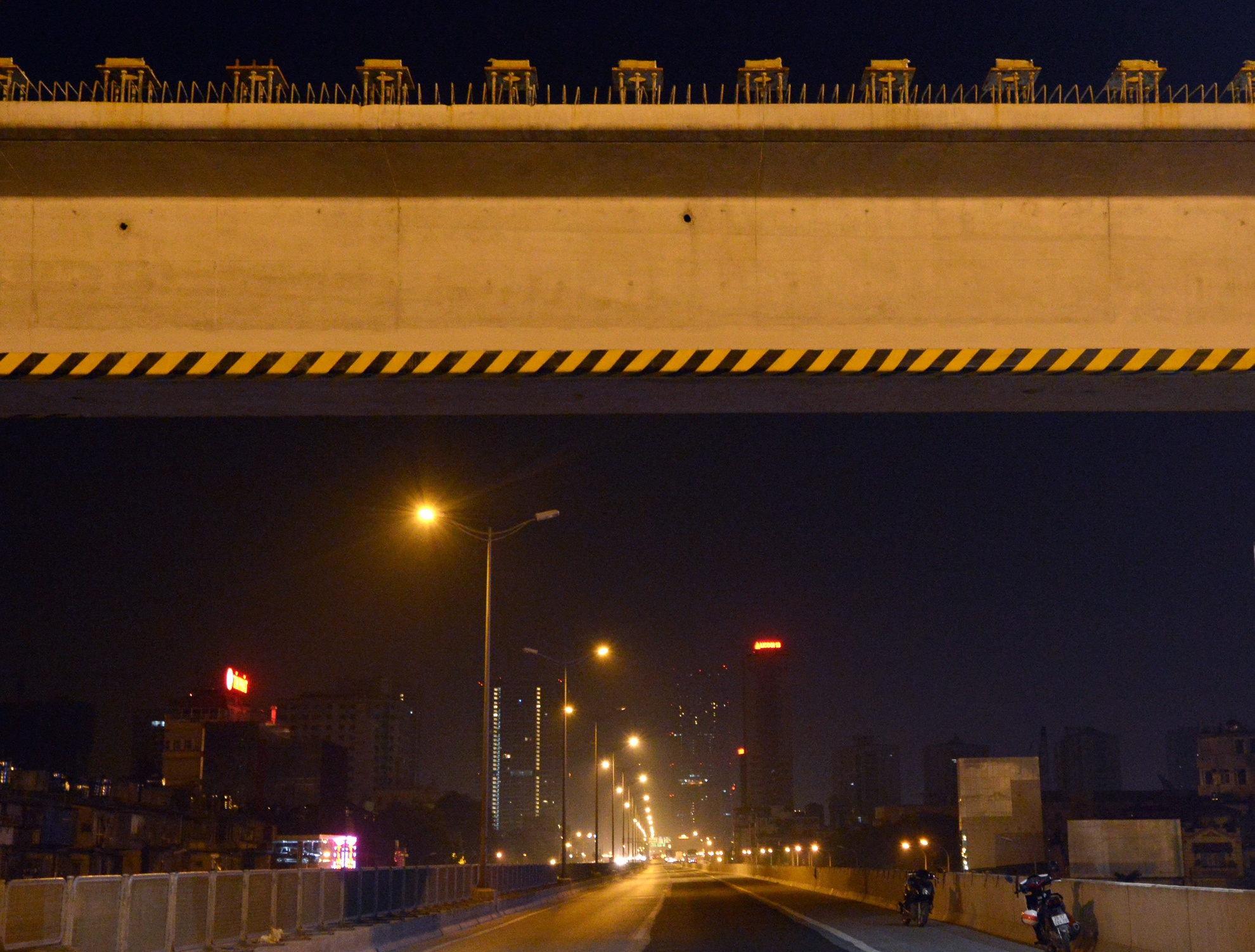Gần 5h sáng cũng là lúc công việc lắp đặt kết thúc. Hai phiến dầm đặc biệt này có độ cao so với mặt đất hơn 20 m. Trong sáng 14/7 đơn vị thi công cắm biển hạn chế chiều cao trước hai lối lên ở khu vực ngã tư Nguyễn Trãi - Khuất Duy Tiến từ đường trên cao vành đai 3.