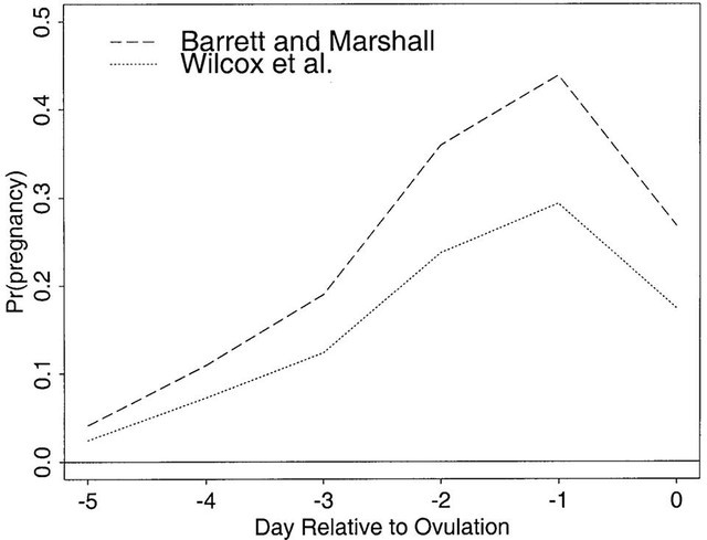 Trục tung là khả năng có thai/1 lần giao hợp, trục hoành là ngày giao hợp tính theo ngày rụng trứng (ngày 0). Cả 2 nghiên cứu của 2 tác giả đều cho thấy, ngày giao hợp có khả năng có thai cao nhất là ngày (-1) và ngày (-2). Giao hợp vào ngày rụng trứng thì khả năng có thai tương đương 1 lần giao hợp 3 ngày trước rụng trứng!