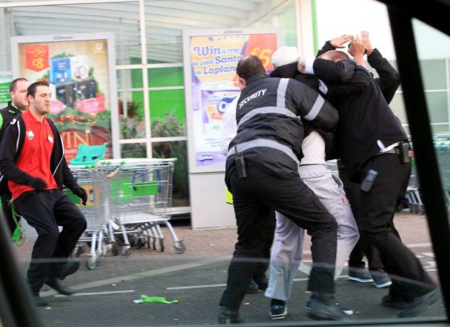 | Nhóm nhân viên bảo vệ siêu thị khống chế người đàn ông rồi đưa anh ta ra ngoài. Ảnh: SWNS. |