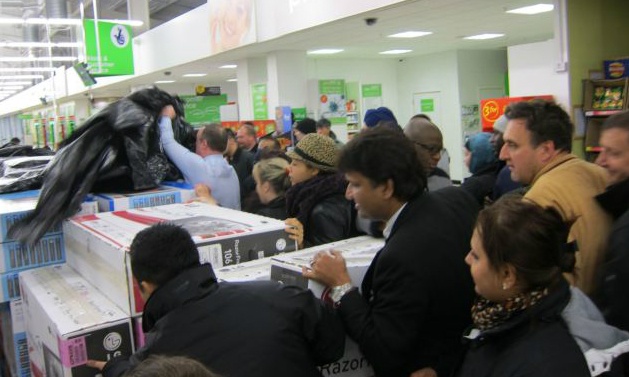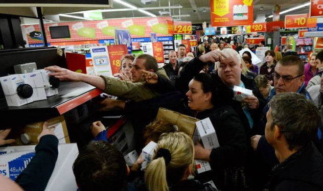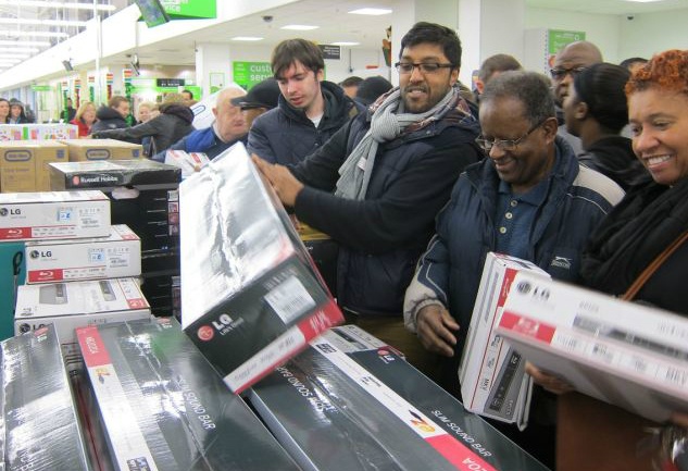 | Đám đông cố gắng lấy những sản phẩm cuối cùng trên giá trong trung tâm mua sắm Asda ở Benton, North Tyneside. Giá của nhiều loại máy tính bảng ở đây chỉ là 49 bảng (khoảng 1,5 triệu đồng), còn giá của nhiều điện thoại cảm ứng của Samsung là 99 bảng (khoảng 3 triệu đồng). |