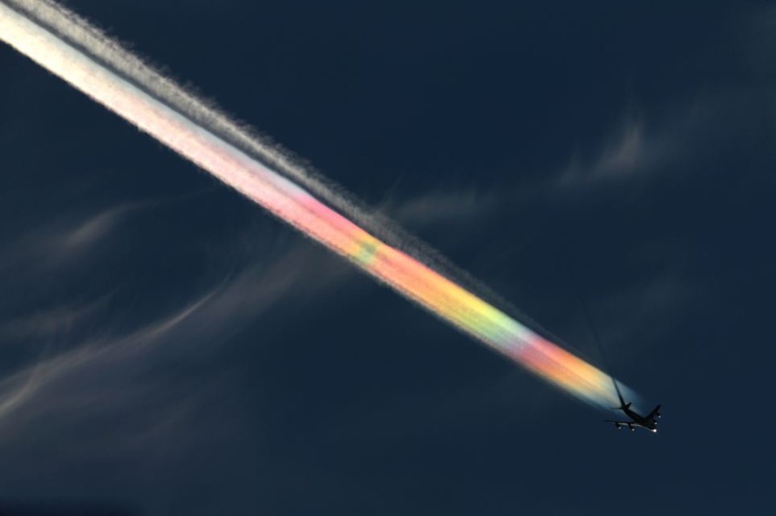 Ánh nắng chiếu qua vệt khí thải của một chiếc máy bay chở khách, tạo thành những màu sắc độc đáo trên không trung. Ảnh: Tân Hoa Xã. |