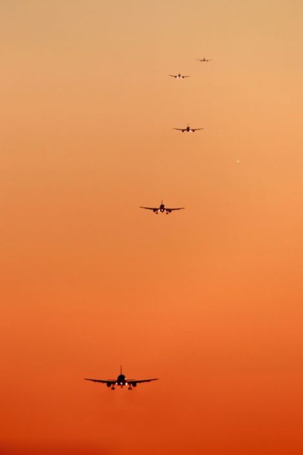 Đàn chim sắt chuẩn bị hạ cánh xuống cùng một sân bay. Khoảng cách giữa những chiếc máy bay vừa đủ để những chiếc xuống trước kịp vào nơi đón trả khách. Ảnh: Tân Hoa Xã. |