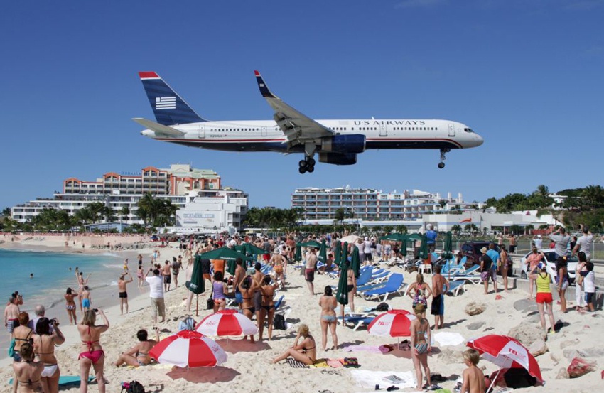 Máy bay chở khách chuẩn bị hạ cánh trên đường băng nằm sát bờ biển tại Sân bay Quốc tế Công chúa Juliana, Sint Maarten, Đông Caribbe. Do hòn đảo quá nhỏ, người ta buộc phải xây dựng đường băng cắt đôi danh thắng này. Ảnh: Tân Hoa Xã. |