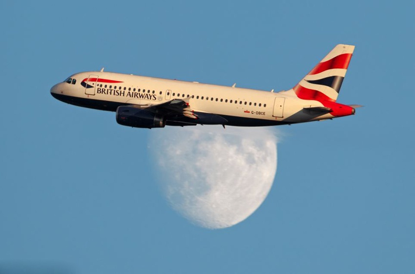 Mặt trăng phía xa làm nền cho chiếc máy bay chở khách của hãng hàng không British Airways, khiến nó trở nên khác thường. Ảnh: Tân Hoa Xã. |