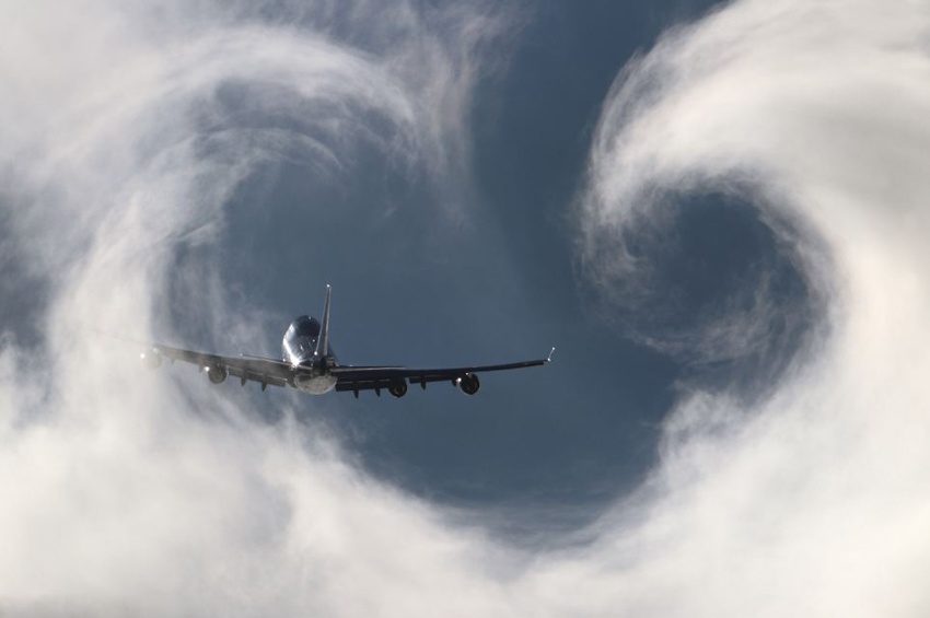 Máy bay chở khách bay xuyên qua đám mây hình xoắn ốc độc đáo. Ảnh: Tân Hoa Xã. |