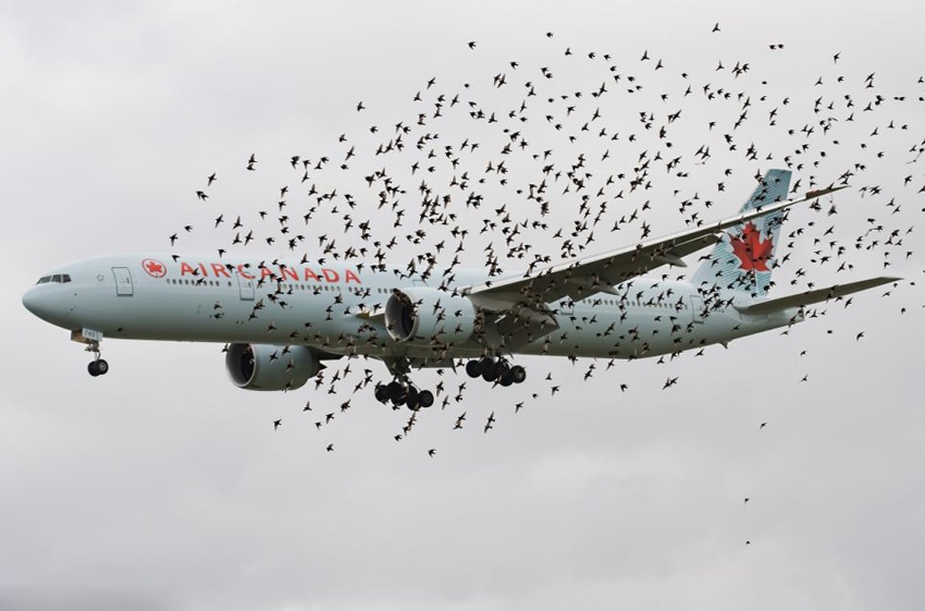 Con chim sắt lạc giữa bầy chim. Tuy nhiên, đây là một trong những tình huống hiểm nhất đối với máy bay, bao gồm cả máy bay chở khách và máy bay quân sự. Những con chim có thể phá hủy cấu trúc thân máy bay hoặc vô hiệu hóa cả 2 động cơ nếu chúng vô tình lọt vào trong. Ảnh: Tân Hoa Xã. |