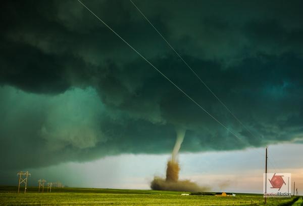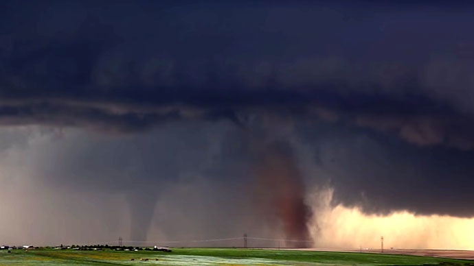 Những cơn mưa đá kèm lốc xoáy tấn công bang Colorado hôm 4/6. Ít nhất 4 vòi rồng hình thành sau cơn bão lớn. Nhiếp ảnh gia Kelly Delay cho biết, anh chứng kiến và ghi lại cảnh tượng vòi rồng kép "nhảy múa" trên bầu trời tại khu vực gần thị trấn Simla vào cùng thời điểm. |