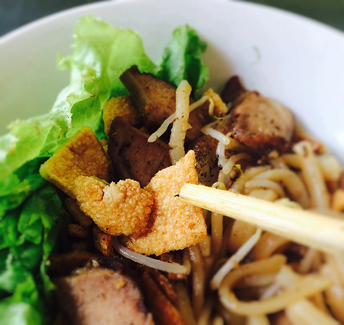 | Trong cao lầu còn có tóp mỡ giòn, ăn kèm rất thú vị. Cao lầu quán này được đánh ngon, dễ hợp khẩu vị mọi người. |