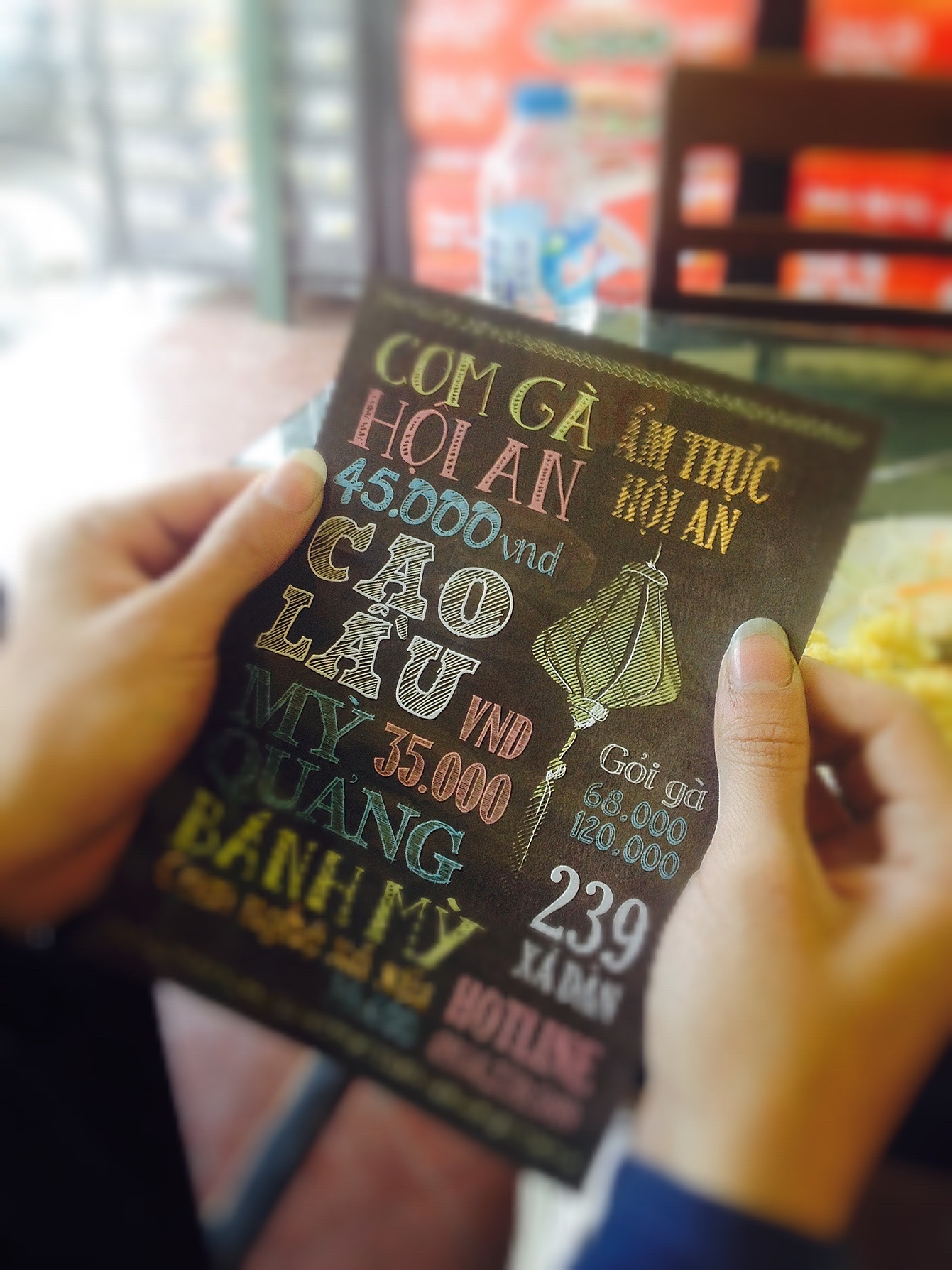 | Ngang qua đoạn cuối phố Xã Đàn, tấm biển "Ẩm thực Hội An" khiến nhiều người để mắt. Ngoài những món như cơm gà, bánh mì, cái tên "cao lầu" sẽ làm nhiều người miền Bắc tò mò. Đặc biệt, quán trông phong cách mà bảng thực đơn đặt trước cửa chỉ đề mức giá 35.000-45.000 đồng. |