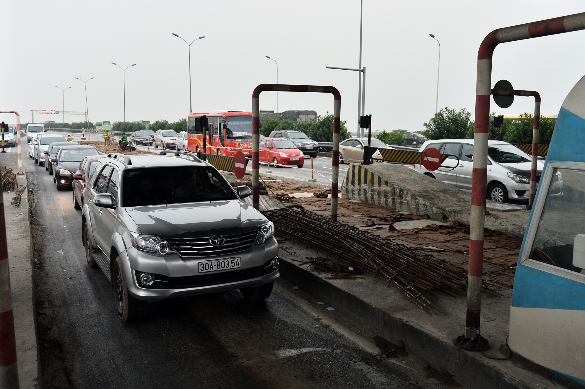 | Nguyên nhân là do trạm thu phí này cũng được đại tu. Một số làn thu phí bị rào chắn để đổ lại bê tông, thay thế nền nhựa bị hỏng. |