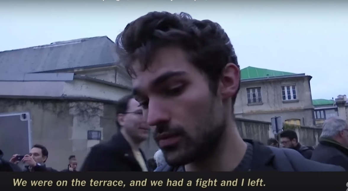 Quentin Bongard - nhân vật nam chính - trả lời phỏng vấn trên iTele, anh và bạn gái có cuộc hẹn ở nhà hàng La Belle Equipe vào buổi tối định mệnh ấy. Họ ngồi ăn trên vỉa hè bên ngoài quán và xảy ra tranh cãi.