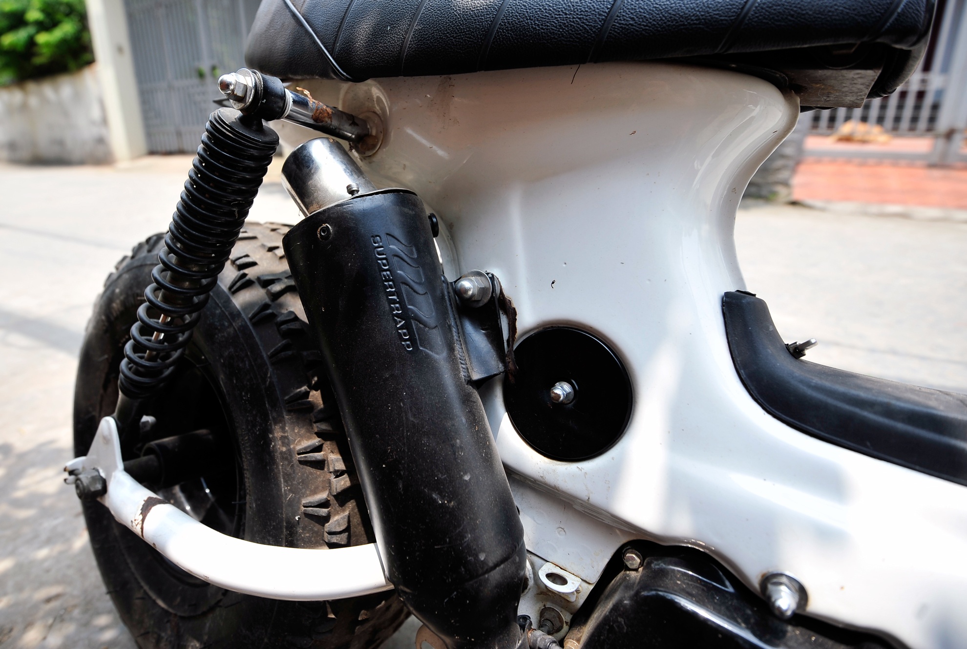 | Chiếc Chaly màu trắng đời 79 sử dụng ống pô Supertrapp, cho tiếng ấm hơn khi tăng tốc với chiếc xe có bộ lốp khá to như thế này. |