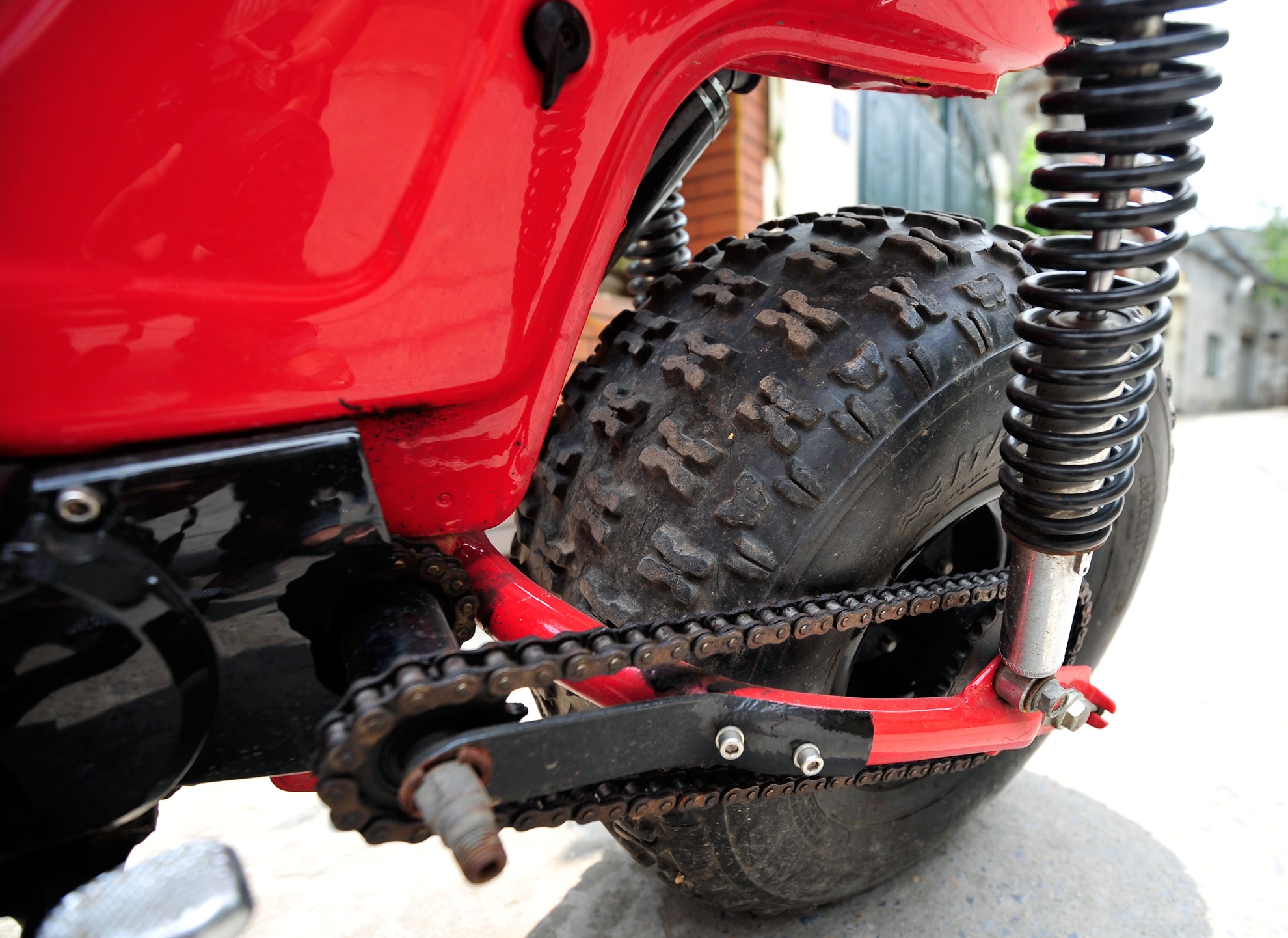 | Động cơ 110cc được nối với hệ thống truyền động bánh sau với adapter 2 hàng xích để chạy lốp bản to. |