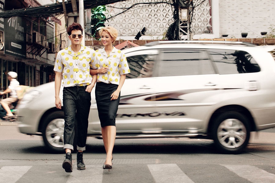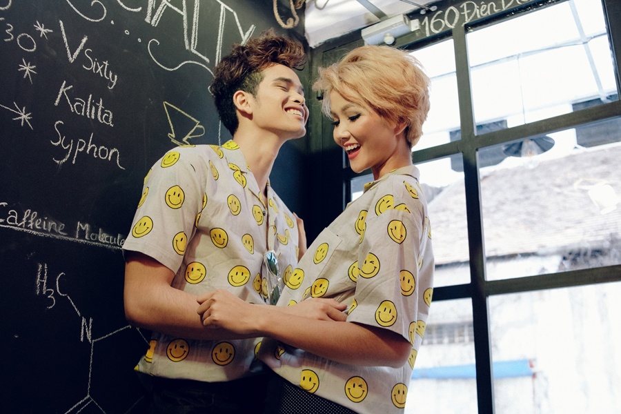 | Họ cùng diện trang phục đôi trẻ trung, cá tính và hiện đại. Áo sơ-mi in họa tiết mặt cười khá vui nhộn, mang đến hình ảnh hài hước, tươi trẻ. |