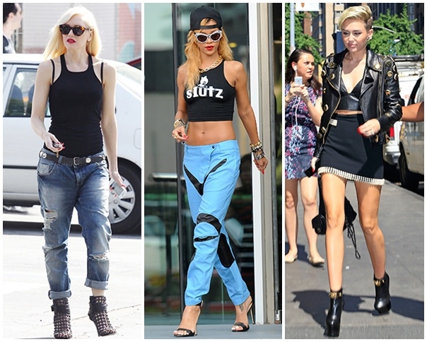 áo bên trong chất da cá tính, Rihanna nổi bật với quần phong cách thể thao, áo croptop. Gwen Stefani diện quần boyfriend, áo thun