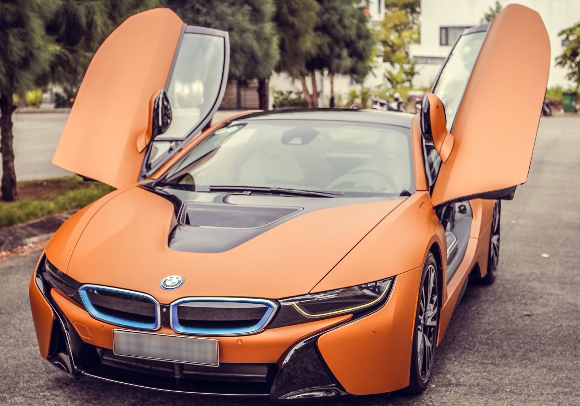 Màu sơn nguyên bản của 2 chiếc BMW i8 đều là màu trắng nhưng một chiếc đã được dán decal màu cam nổi bật. |