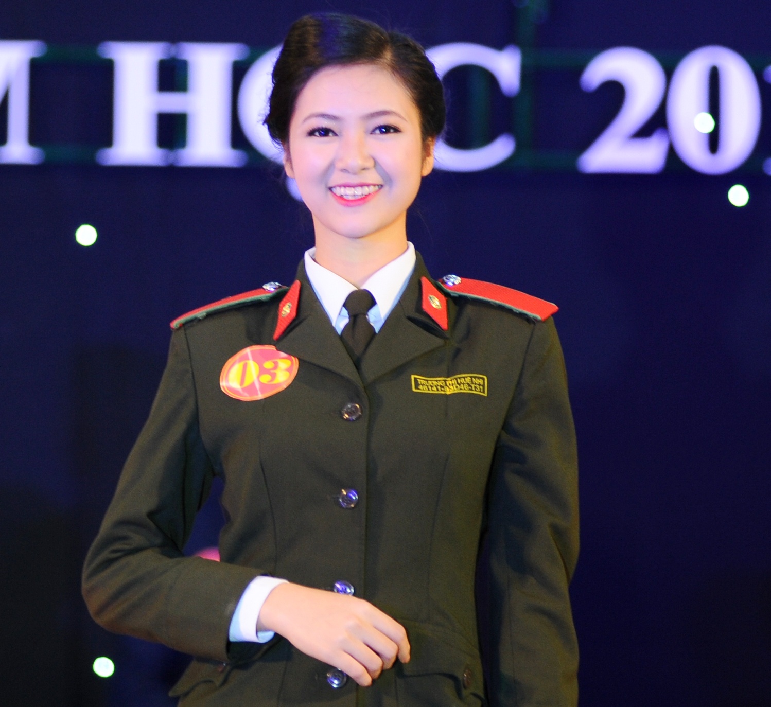 | Tối 15/12, Học viện An ninh Nhân dân (Hà Nội) tổ chức vòng chung khảo cuộc thi Sinh viên An ninh thanh lịch 2015 nhằm tìm kiếm gương mặt nam thanh, nữ tú, đại diện cho ngôi trường đi đầu về đào tạo lực lượng vũ trang nhân dân. Mở đầu đêm chung kết là phần thi trang phục bắt buộc. Khuôn mặt rạng rỡ của Trương Thị Huệ Nhi - sinh năm 1996, sinh viên lớp B3D46, nổi bật trong màu áo ngành. |