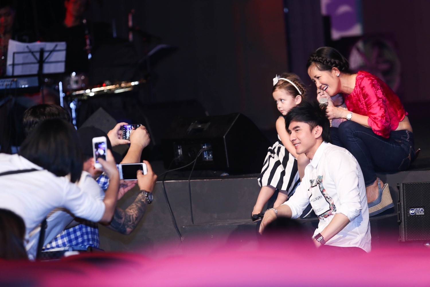 | Ca sĩ Đan Trường và nhiều nghệ sĩ ngỏ lời chụp ảnh cùng cặp song sinh. Tuy nhiên, mẹ Bống gặp không ít khó khăn để khiến hai con có thể chịu ngồi yên. |