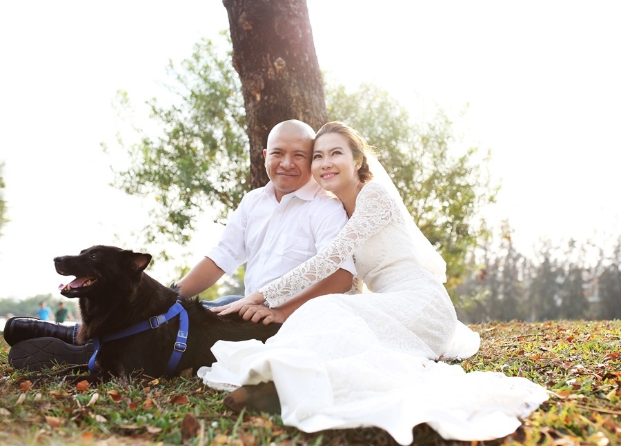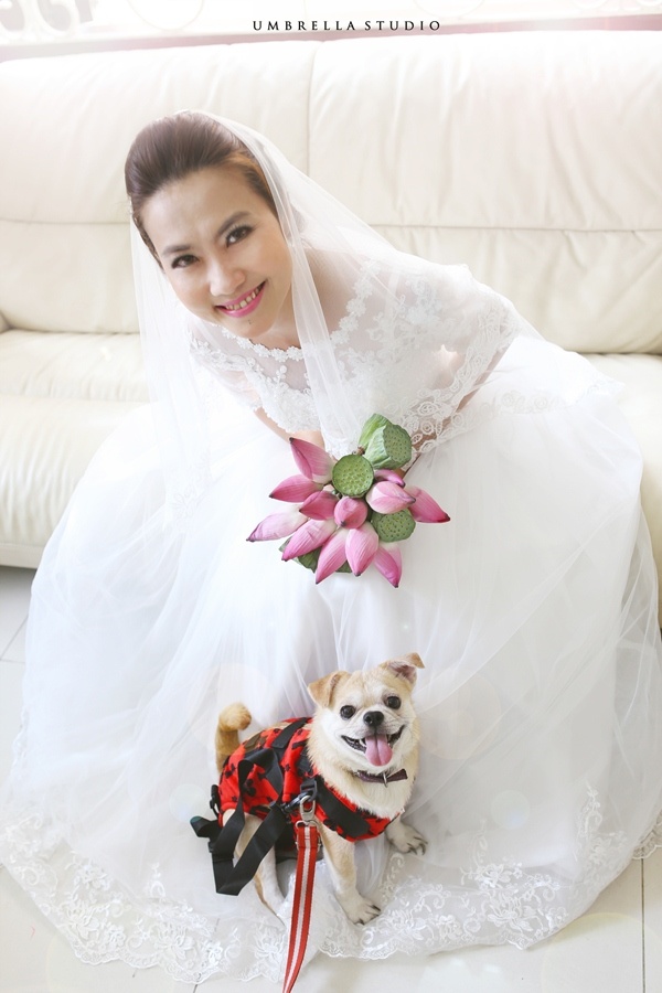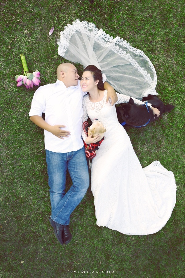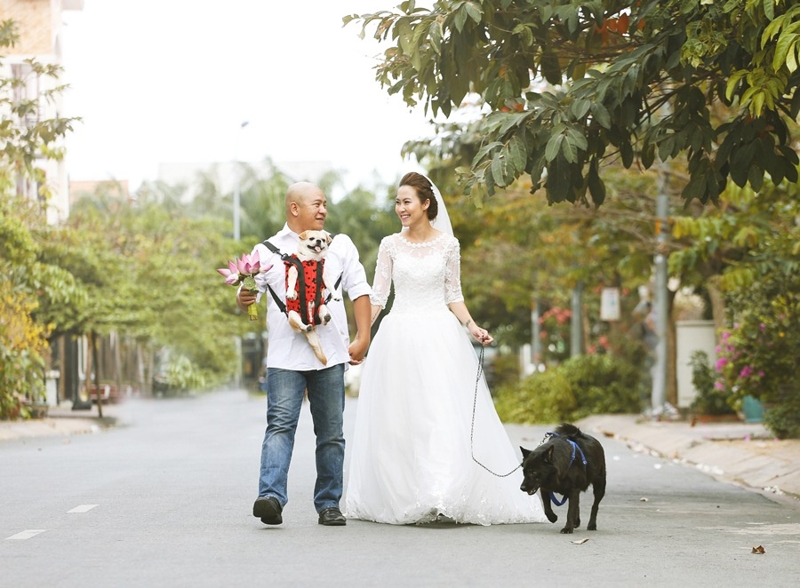 Là người yêu động vật, Vi Thảo Nguyên đã từng cưu mang hàng trăm chú chó, mèo cơ nhỡ. Bộ ảnh cưới của cô rất độc đáo khi có những người bạn đồng hành là vật nuôi.